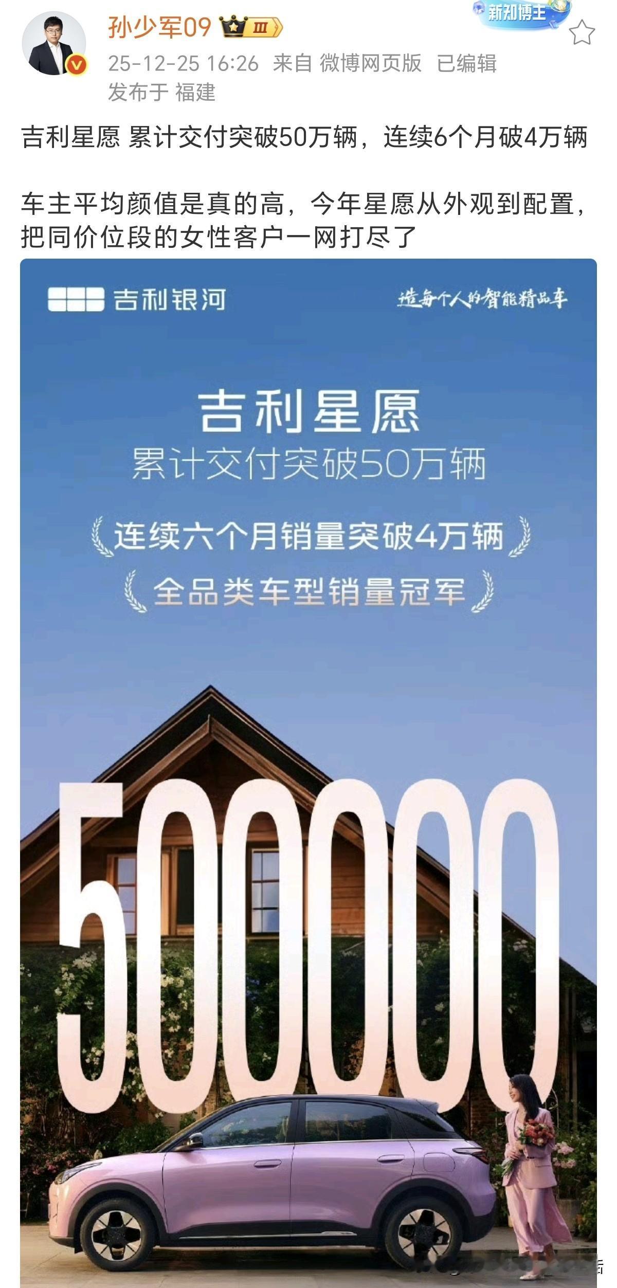 孙少军:吉利星愿车主平均颜值是真的高,今年星愿从外观到配置,把同价位段的女性客户一网打尽了。 吉利星愿今年完全是碾压了, 累计交付突破50万辆,连续6个月破4万辆,超越五菱宏光MINIEV和特斯拉Model Y,获得2025年全品类车型销量冠军,真应了那句话,双手插兜不知谁是对手! 吉利星愿是吉利银河旗下纯电代步车,车身小巧(车长4.13米)、转弯半径仅4.95米,灵活性高;空间大,70L前备箱+375L后备箱,6.88万起的售价,搭载独有的后置后驱+独立后悬、越级空间与高性价比,适合城市通勤。车子好不好,销量自然会说话,我就问你,这都是用户花费自己的真金白银选择出来的,能不好吗?你们觉得呢?