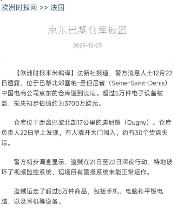 京东巴黎仓库被洗劫3个亿,很多人以为是法国治安太差,遇上了流氓。错了!真相是,这是一场精准到秒的“内鬼级”军事行动! 这起事件发生在 2025 年 12 月 21 日深夜,法国巴黎的京东仓库。当天早上工作人员到岗时,一眼就发现了异常,仓库大门的铰链被人用专业工具拆了,多个出入口都有损坏痕迹,原本整齐堆放的 30 个托盘货物不见了,地上散落着包装碎片,空气中还有金属摩擦的刺鼻气味。 初步统计显示,失窃的是荣耀、OPPO 等品牌的手机、电脑、平板等 50456 件高价值 3C 产品,法国媒体一开始援引警方数据,说损失约 3700 万欧元,折合人民币超 3 亿元,不过后来京东在 12 月 23 日晚间回应,称网传损失金额和实际情况有较大出入,实际损失约 300 万欧元,折合人民币 2350 万元,目前已经启动了全球保险理赔程序。 最让人觉得不简单的是作案团伙的专业程度。他们不是漫无目的地搜寻,而是直接直奔存放高价值 3C 产品的区域,精准锁定了 30 个装满货物的托盘,对于笨重的家电和廉价的日用品完全不碰。要做到这一点,必须对仓库的货物分布了如指掌,普通小偷根本不可能清楚这些细节。 更关键的是,仓库的安防系统在整个作案过程中完全失效了。团伙成员先破坏了仓库外围的供电系统,然后用液压剪突破了三重防护门。进入仓库后,他们第一时间摧毁了所有监控摄像头和后端存储服务器,要么断电要么直接损毁,让整个作案过程没留下任何影像记录。 原本应该实时响应的震动感应器和红外探测装置也全程没发出任何警报,既没有声光提示,也没向安保控制中心发送异常信号。 这些操作不是随便什么人都能完成的,需要专业的工具和技术。团伙还携带了 RFID 写入设备,篡改了货盘的电子标签信息,让仓库的管理系统误以为这些货物是正常发货,为他们撤离争取了更长时间。 之后他们驾驶三辆悬挂伪造京东物流牌照的 7.5 吨冷链货车,分批次把赃物运离现场,整个过程只用了三个小时,直到凌晨 4 时 05 分,值班保安才发现异常。 更可疑的是,案发当晚仓库的安保排班出现了明显异常,值守人数远低于日常标准。这种安保薄弱的 “空窗期” 能被作案团伙精准把握,很难用巧合来解释。 仓库内部员工事后透露,案发后心里很压抑,所有线索都指向安全防线可能从内部被攻破了。毕竟如果不熟悉仓库的结构、监控布局、巡逻路线和安保漏洞,外人根本不可能完成如此严密协调的行动。 法国警方也已经注意到这一点,目前这起案件已经被移交专门负责打击有组织犯罪的反黑帮特别行动组处理,这也说明案件性质不是普通的商业盗窃,而是重大恶性有组织犯罪。 还要提一下案发地的背景,塞纳 - 圣但尼省虽然交通便利,靠近勒布尔热机场和主要高速公路,适合布局物流仓库,但这里却是法国出了名的治安薄弱区域。 数据显示,该省 2024 年的入室盗窃案就有 5532 起,青年失业率接近六成,移民融合困难,地下经济活跃,长期都是犯罪团伙重点关注的区域。有当地华人居民甚至说被抢是家常便饭,还有华人治安委员会主任几年内遭遇过十几次抢劫。 京东选择在这里布局核心备货仓库,可能是考虑到租金成本和物流便利,但显然对当地的治安风险预判不够充分。 不过目前案件还在进一步调查中,法国警方还没有公布任何嫌犯落网的消息。京东方面已经表示涉事仓库已经恢复常规运营,核心数据和客户信息安全没有受到影响,会正常履行欧洲订单,保证圣诞促销照常进行。 这起案件也给出海企业提了个醒,海外仓储不仅要考虑成本和物流,安防体系的本土化适配和内部管理的信息保密也同样重要。 尤其是在治安风险较高的区域,更需要建立完善的人员背景审查制度、信息保密制度,还要和当地警方建立快速联动机制,才能更好地防范风险。