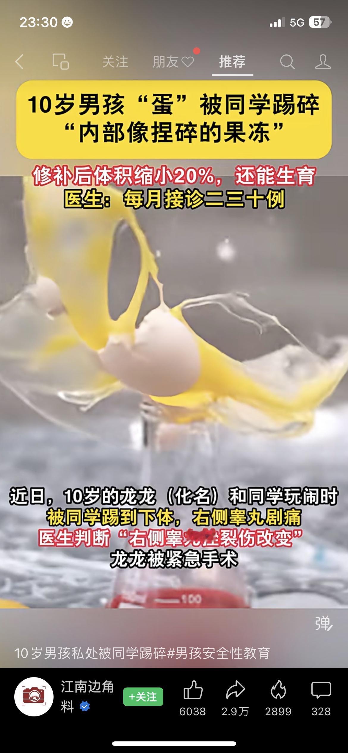 😱揪心!10岁男孩玩闹被同学踢碎睾丸,医生坦言:每月都接诊二三十例! 真的看完心里咯噔一下!浙江10岁的小男孩龙龙,跟同学在学校玩闹的时候,不小心被一脚踢中要害,右侧睾丸直接挫裂伤,里面跟捏碎的果冻一样,万幸手术修补成功,但睾丸体积还是缩小了20%! 更让人后怕的是,浙大儿院的医生说,他们泌尿外科几乎每个月都能接诊二三十例这类孩子,全都是因为玩闹没轻重、隐私部位没做好防护导致的,有的孩子伤势严重,甚至影响到未来的生育功能! 家里有男孩的家长,真的一定要上心!别觉得孩子小,不用讲这些,恰恰是因为孩子没分寸,才更容易出意外。一定要反复跟孩子说,自己的隐私部位绝对不能让别人碰、也不能随便去冲撞别人的要害,玩闹的时候一定要有分寸,别疯跑乱踢! 学校也得多做安全教育,课间玩耍、体育课上,老师多盯着点,别让这种揪心的意外再发生了。孩子的身体经不起半点马虎,保护好他们,才是最要紧的事! 儿童安全教育 男孩防护 校园安全 家有男宝的家长,你平时会跟孩子讲隐私部位防护吗?评论区聊聊!