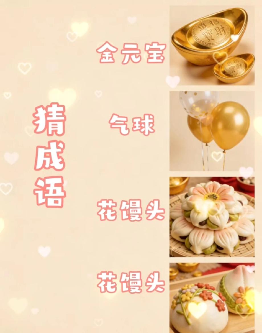 谁懂啊!金元宝气球花馒头凑一起猜成语,这题太考验脑洞了,评论区来战