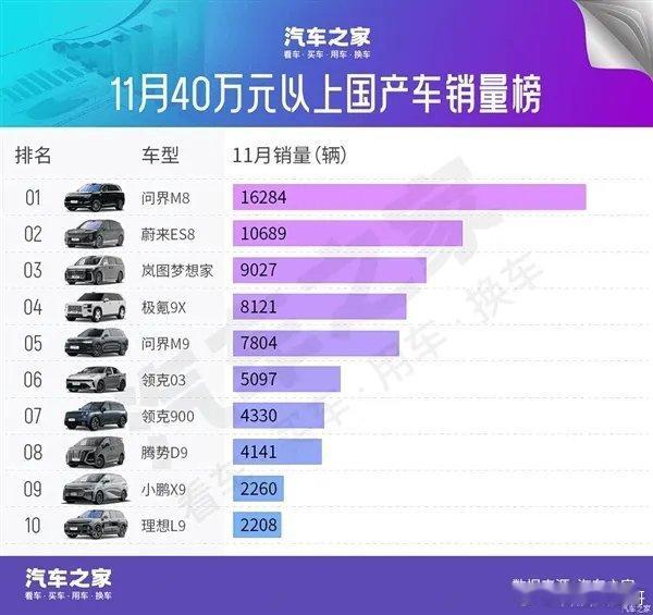 好,咱们来好好盘盘汽车之家11月这份40万以上的豪车销量榜。看完这三个榜单,最大的感受就俩字:变天。以前这个价位完全是BBA(奔驰、宝马、奥迪)的天下,但现在,国产车不仅冲进来了,还坐上了头把交椅,整个市场的格局和玩法都彻底变了。下面,咱们掰开揉碎了看:1. 总榜:一场“王位”交接的预演问界M8以超过1.6万辆的绝对优势夺冠,这意义非凡。它比第二名的奥迪A6L还多卖了近1000辆。这说明在40万+这个曾经由品牌光环统治的战场,强大的产品力(特别是智能座舱、智能驾驶)已经能击穿传统的品牌壁垒。奥迪A6L和Q5L能紧随其后,靠的是众所周知的大幅终端优惠,属于“以价换量”。而蔚来ES8作为榜单前五中另一个国产选手,销量也稳稳破万,证明了高端纯电市场的需求是真实存在的。2. 合资榜:BBA的“守城战”与“内卷”这张榜单几乎是BBA的“内部成绩单”。奥迪两款车领先,奔驰GLC和E级、宝马5系和X3紧随其后。这说明在传统燃油豪华车领域,BBA的认知度和号召力依然强悍,但这份强悍现在需要靠大幅度降价来支撑。榜单后半段的车型,如宝马X5、沃尔沃XC60等,销量已经跌到7000辆以下,显示出在激烈内卷下,非BBA的合资豪华品牌生存空间被严重挤压。3. 国产榜:一场“群雄并起”的盛宴这是最精彩的部分,充分展示了国产车的集群突破。榜首问界M8自不必说,亚军蔚来ES8也过了万辆。第三、第四的岚图梦想家(MPV)和极氪9X,销量都在8000-9000辆级别,表现非常扎实。更关键的是,榜单车型类型非常丰富:有大型SUV(问界M9、理想L9),有MPV(梦想家、腾势D9、小鹏X9),有轿车(领克03),甚至还有猎装车(极氪9X)。这说明国产车不是靠单一爆款,而是在多个高端细分市场都建立了影响力。当然,内部竞争也已白热化,同为热门MPV的腾势D9和小鹏X9,销量已有差距;曾经的标杆理想L9,在这个月榜单中已跌至第十。4. 核心驱动力与未来趋势为什么会有这样的剧变?核心就两点:技术换道:国产车在新能源(纯电/增程/插混)和智能化(智能座舱、高阶辅助驾驶) 上确立了巨大优势。消费者花40多万,越来越看重这些体验,而不仅仅是车标。价值重估:BBA通过降价维持销量,实质上是在消耗品牌溢价来应对竞争。而问界、蔚来等国产车,价格坚挺甚至需要排队,证明其提供的价值获得了市场认可,正在建立新的“价值锚点”。总结一下:11月的这份销量榜,像一份清晰的战报。在40万+的高地,攻守之势已易。以问界、蔚来为代表的国产新能源军团,凭借技术换道的先发优势,已经从“挑战者”变成了“引领者”,并且形成了集团军。而传统的合资豪强,尤其是BBA,正依靠深厚的品牌底蕴和果断的价格策略,打一场艰难的“防御战”。未来的战场,将是国产阵营之间如何进一步分化,以及传统巨头如何加速电动化、智能化转型的反击。可以肯定的是,躺着赚钱的时代一去不复返了,最终受益的,将是享受到更好产品和更卷价格的消费者。