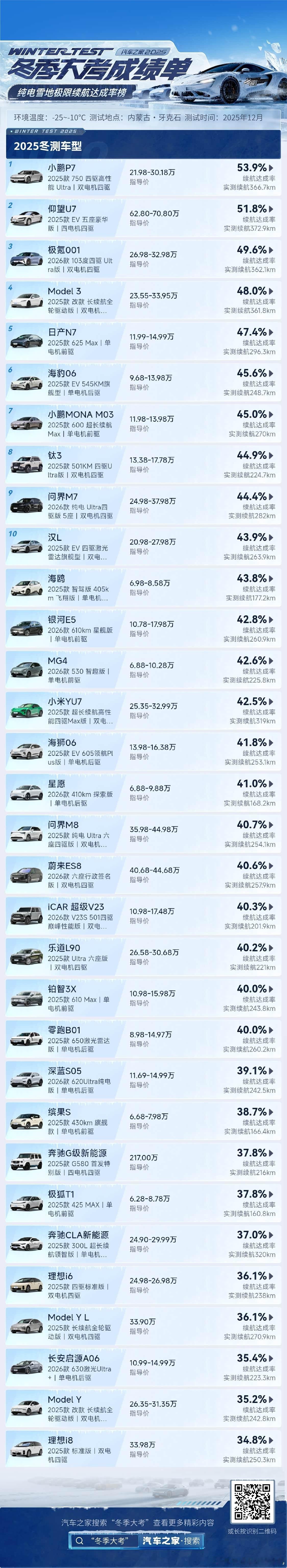 汽车之家的冬测之——纯电续航达成率。我最意外的是,车重近3.3吨的仰望U7居然能