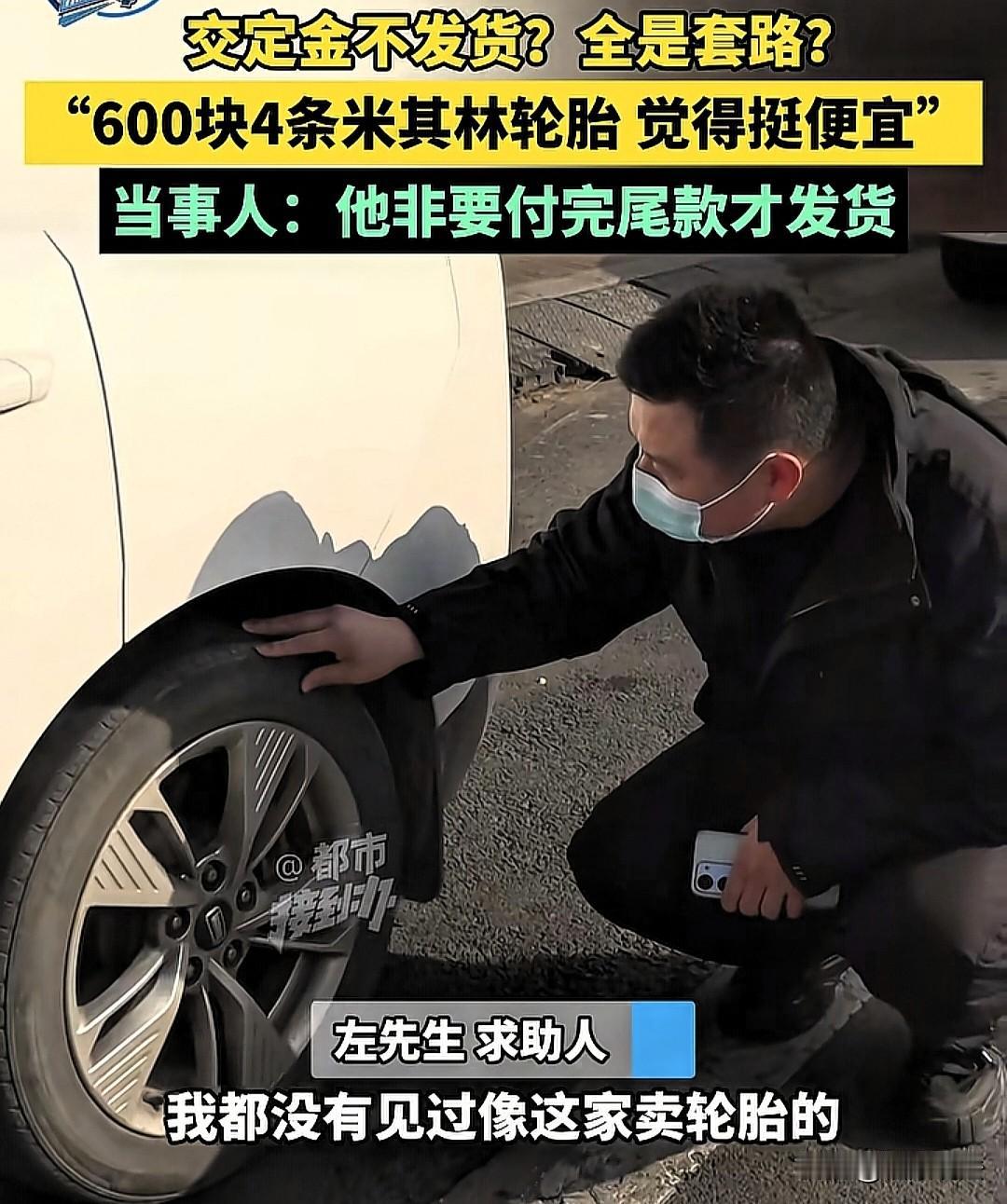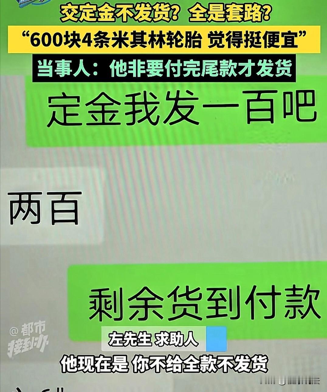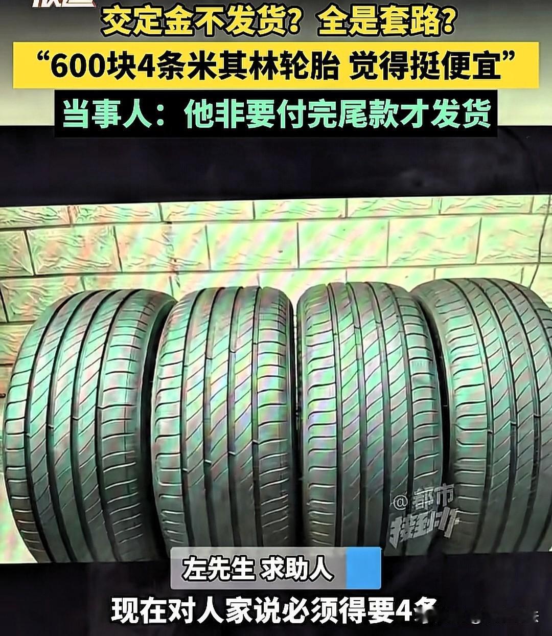 “贪小便宜吃大亏!”河南郑州,男子在网上买了4条二手米其林轮胎,共600元,他交了200定金,说好货到付尾款,不料,店家耍赖不发货,非让男子付完尾款才发货,男子查了物流单号,发现发货地和收货地一样,而且,卖家连个手机号也不留,男子担心收到货时质量不好无法退货,要求退还定金。卖家却说:合适就把4条轮胎钱付了,不付我就把轮胎拉回,不合适我也没办法了。结果让男子非常无奈! 左先生最近跑网约车,可他发现车轮胎跑起来有些轻微颠簸,感觉轮胎好像不行了这也不安全了,打算换下轮胎。 可是新轮胎比较贵,他就在网上查看,一天他刷短视频时看到一个卖二手轮胎的,还是米其林的,从视频上看还不错。 其实,让左先生动心的是,卖家的轮胎相对来说比较便宜,他便联系对方询问价格。 对方说:“米其林精品一套,200块钱一条,大哥需要几条?” 左先生说他要2条就够了,可是,对方坚持不单独卖,你要买就必须4条。 于是,左先生和对方讨价还价一番,最终说好600块钱4条轮胎。 为了留个保障,左先生付给对方200块钱定金,还专门打了一行字:“剩余货到付款。” 然而,当左先生等待对方发货时,对方却耍赖了,非让他将剩下的尾款全部结清,这样才能给他发货。 左先生当时都惊呆了,自己开车快20年了,可以说平均一年换一次轮胎,买过这么多次轮胎,还真是头一次遇到这种卖轮胎的。 本来正常流程就是,我买了轮胎后,交了定金后,卖家给我物流发货,我货到付款,明明当时说好了,对方也同意了,那怎么又变卦了,不给全款不发货? 左先生说那不发货,我就不要了,或者你给我发两天轮胎也行,不行就把200定金退给我。 可没想到,对方说,必须得4条轮胎,另外轮胎清洗费、人工费、物流费谁给我结算? 左先生非常气愤,这不就是强买强卖吗? 随后,左先生查了物流单号,可怎么都查不到,而且,他又查了订单上面物流公司,发现根本没有这个公司。 更让他惊讶的是,订单上的二维码扫出来的物流信息发货地与收货地竟然是一个地方徐州,根本不是到左先生家的河南。 左先生觉得这里面有猫腻,他说现在货还没到手里,而且,他与对方联系只有微信,甚至连个电话号都没有。 如果说,到时候收到货后质量不好,对方把自己微信一拉黑,自己找谁去? 然而,卖轮胎的商家说,你要是结尾款后,晚上这个货我就让他们送走了。 左先生说出自己的顾虑:“我也不认识你,你连个手机号都不留,我去哪找你?” 可是商家答非所问,咱们要不要人工清洗,还得拿出来清洗做高压测试,然后给你打包,给你送物流,合适你就把4条轮胎尾款付了,不付的话我也只能让他拉回来了,你感觉我们做的还不到位的话,那我也没办法了! 商家说完,直接挂断电话,再打就打不通了。 左先生是又好气又好笑,没想到遇到这种卖轮胎的,他找了记者想看看还有别的办法吗? 有人说,600买四条米其林轮胎,借大哥一句话,我开车快20年了,我从没遇过这种情况,大哥你是怎么想的? 这种价格别说二手的,就是八手的也买不着啊。 我刚换了四条,二手的900,你买的600,我感觉买不到。 也有人说,骗子是先给你一个虚假单号,让你付尾款,付了才会发,发过来二手的就是报废轮胎。 这个是骗人的,我都被骗了920元4条,发过来就是报废轮胎,要在平台上下单,不要私下交易。 还有人说,大家看到的是这个大哥贪小便宜吃了大亏,其实这何尝不是这几年行情不好、钱不好挣,大哥也是想能省点是点,我看到的不是大哥贪小便宜吃大亏,而是看到了一个中年人对生活的妥协和无奈。希望大家都能大大方方的买自己喜欢的东西。 从法律角度来说,左先生与商家就购买轮胎事宜达成一致,并支付了200元定金,且明确约定了“剩余货到付款”。 双方已形成了定金合同关系。 商家在左先生支付定金后,单方面要求改变付款方式,拒绝按照约定货到付款,而且,未能按照约定发货,已构成违约。 因此,左先生有权要求商家退还200元定金。 那么,左边想买2条轮胎,商家非卖4条构成强买强卖吗? 《治安管理处罚法》第46条规定:强买强卖商品,强迫他人提供服务或者强迫他人接受服务的,处五日以上十日以下拘留,并处二百元以上五百元以下罚款。 商家在左先生明确表示只购买2条轮胎后,坚持要求其购买4条。 并在左先生支付定金后,单方面改变付款方式,拒绝按照约定发货,甚至以不发货为威胁要求左先生支付全部尾款,这种行为已涉嫌强买强卖。 因此,左先生可以向相关部门举报。 在记者的帮助下,左先生通过12345投诉了商家,他说:我的诉求就是把定金给我退了。他还表示接下来会在邮政小程序上去申诉。 左先生面对镜头说,其实这200块钱真的要不回来也没啥,最主要是给大家提个醒,买东西一定要确认对方信息在买,包括查看物流信息,也不要私下交易。