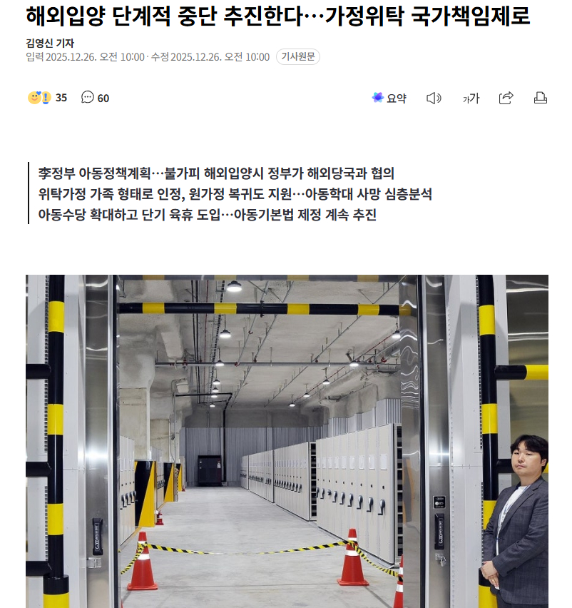 【韩国政府宣布将分阶段停止海外领养,推行国家负责的家庭寄养制度】海外新鲜事热点现场 韩国政府正在推进分阶段停止海外领养的方案。优先考虑在国内收养等方式对儿童进行国内保护,中远期将停止海外领养。韩国保健福祉部26日经国务总理担任委员长的儿童政策调整委员会的审议和表决,确定了"第3期儿童政策基本计划"(2025~2029年)。儿童政策基本计划是根据《儿童福利法》每5年制定的政府层面的基本计划,此次第3期计划是李在明政府的儿童政策蓝图。此前,李在明曾在今年10月表示:"大韩民国曾一度蒙受过'儿童出口国'的耻辱","国家将成为领养人的坚实后盾。"加强对需要帮助儿童的国家责任…推动公共收养落地及停止海外领养韩国政府一直致力于推进由国家负责管理和监督、过去由民间领养机构主导的领养工作。今年7月,引入了由国家、地方自治团体管理的"公共领养体系",10月还批准了为保护因国际领养而在国家间移动的儿童人权而通过的国际公约——《海牙国际儿童收养公约》。据此,韩国政府制定了由福祉部、地方政府、公共机构以儿童利益为最优先考虑,决定和管理整个领养程序的方针。个别领养相关事项,将根据"儿童最大利益"原则,在福祉部部长担任委员长的领养政策委员会进行审议和决定。更进一步,政府设定了停止海外领养的目标。计划中远期推进分阶段停止海外领养,在不得已进行海外领养时,由福祉部作为中央主管机关与海外当局、相关机构相互协商进行程序。同时,将需要保护的儿童在一定期限内寄养在家庭中成长的家庭寄养制度,也将改革为由国家负责和管理的体系。将增加对寄养家庭的支持,并扩大能够保护需要特殊保护儿童的专业寄养家庭。计划通过将寄养家庭认定为新的家庭形态,强化寄养父母的法律权限,从而加强儿童养育的制度基础和责任性。此外,为了让儿童从初期保护阶段就能得到适当的保护,将在广域范围内定期检查家庭寄养、收养家庭、儿童养育设施等保护资源。支持原生家庭回归计划,以便儿童不割断与亲生父母的纽带,能够回归原生家庭。为了预防虐待,将利用人工智能(AI)预测模型强化早期发现危机儿童的系统,并计划扩大对即使未被判定为儿童虐待但需要支持的儿童的预防性支援。对于疑似儿童虐待死亡事件,将进行深入分析。为此,计划在儿童政策调整委员会下设儿童虐待死亡分析特别工作组(暂定名)。同时也在考虑引入审查包括虐待在内的所有儿童死亡原因的制度。对于未登记的外籍儿童,为保障其受教育权,将给予其在韩居留资格至2028年3月。此外,将通过未登记外籍儿童实态调查,探讨引入普遍出生登记制度。扩大儿童津贴并引入短期育儿休假…推进制定《儿童基本法》以支持所有儿童成长和发展为目标,儿童津贴将从明年1月起提高支付年龄上限,直到2030年,每年提高一岁。对非首都圈和人口减少地区将支付儿童津贴追加给付。计划推动引入短期育儿休假制度,并激活灵活工作制,以便工作的父母确保照顾儿童的时间。为保护独处儿童,计划将社区照料设施的延长照料使用时间扩大至24点,并增加参与机构。还将推进制定关于"儿童忽视"的标准。将引入并推广由地区主导运营的小学照料、教育模式——"邻里小学照料",并扩大缝隙型照料和计时制保育服务。为应对儿童数字沉迷,将增加预防、咨询,并与民间合作制定企业的自律规范方案。计划还包括扩大季节性流感预防接种支援的儿童年龄范围,将HPV疫苗的支援对象扩大到男性青少年。政府将继续推进制定《儿童基本法》,该法将明确规定根据联合国《儿童权利公约》的儿童基本权、国家和社会在儿童政策方面的作用等。为了在儿童权利受侵害时提供救济,将推动批准联合国于2011年通过的《儿童权利公约关于设定来文程序的任择议定书》。计划扩大现行司法、行政程序中受限的儿童意见表达权。此外,还计划通过民间合作将儿童友好城市制度化,并引入儿童友好场所认证制度。福祉部第一次官李相兰表示:"我们将努力实现儿童基本社会,让儿童作为权利主体享受基本权利,健康地生活。"