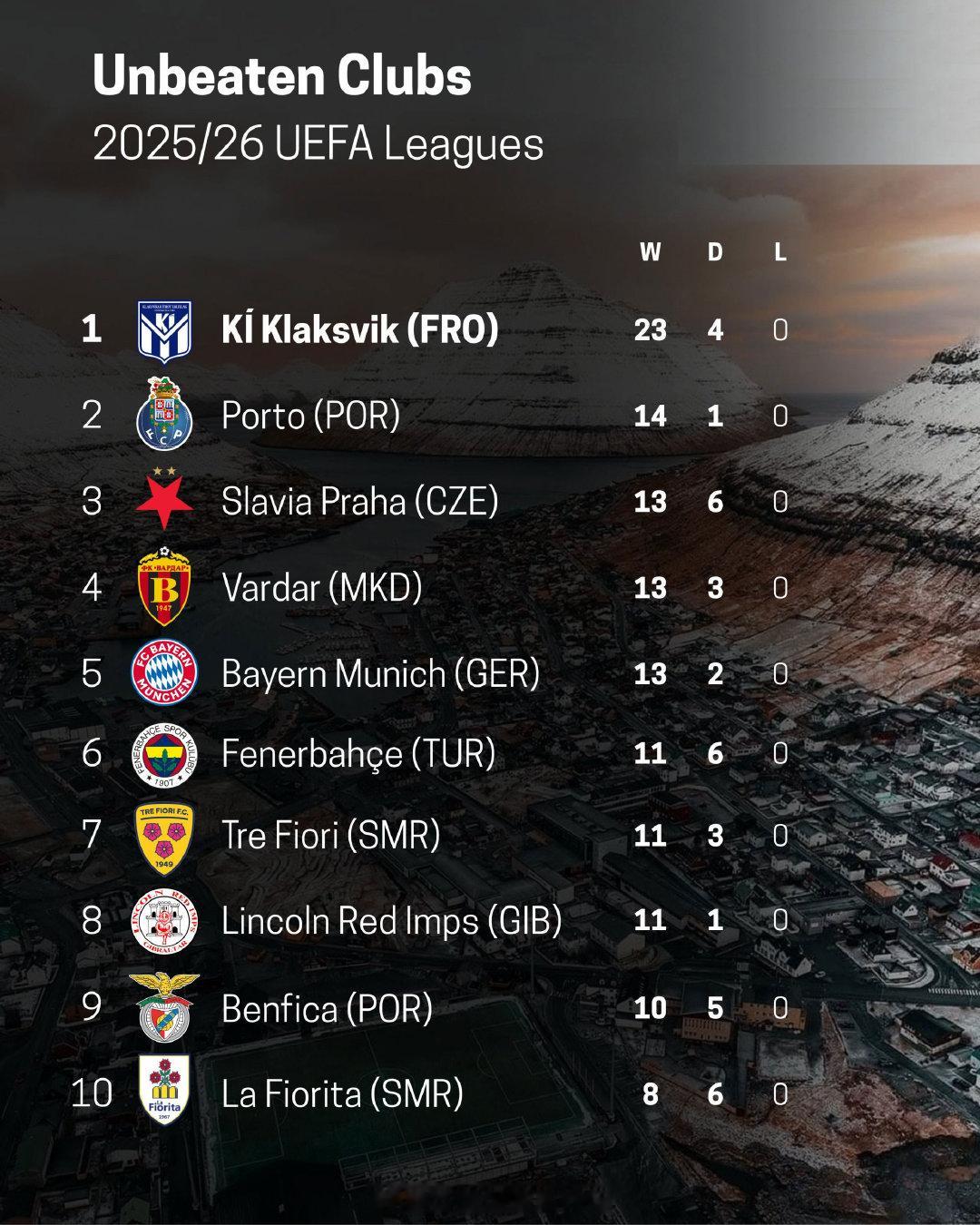 【联赛不败】来到2026年12月下旬,欧洲各国足球联赛,依然有10支球队保持联赛不败,当中包括了德甲巨人拜仁、土超劲旅费内巴切、两大葡超豪门波尔图和本菲卡,而最厉害的当数法罗群罗球队克拉克斯维克,23胜4平!