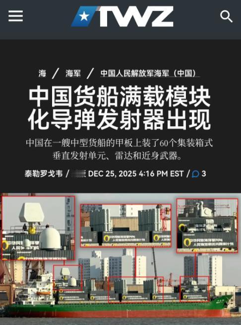 美媒爆料:中国武装商船亮相,搭载60个垂直发射单元,“圣诞惊喜”还在后面。 事情是这样的,美国著名的军事网站《战区》在最近的一篇深度报道里,把目光锁定了一艘看似普通的中国中型货船。 按照以往的思维,货船嘛,顶多就是跑跑运输、拉拉集装箱,跟“火力”二字八竿子打不着,但这次不一样,美国人的卫星和长焦镜头捕捉到的画面,让五角大楼那边有些人坐不住了。 这艘船虽然挂着货船的皮,骨子里却透着一股子“杀气”,大家看这船的配置,舰桥前面居然违和地立着一座大型旋转相控阵雷达,这就好比给一辆拖拉机装上了法拉利的后视镜,专门用来死死盯着空中的威胁。 甚至在雷达旁边,还配备了穹顶状的通信系统,摆明了是要和天上的卫星或者远方的指挥中心实时联网,光有眼睛还不行,这船还得有拳头。 美国媒体惊讶地发现,在船头最显眼的位置,赫然耸立着一座1130型近防炮,熟悉军事的朋友都知道,这可是号称“万发炮”的末端防御神器,一分钟上万发的射速,专门用来拦截那些想搞偷袭的掠海巡航导弹。 给一艘货船装这玩意,说明它压根就没打算要在战时寻求护航,而是具备了独立硬抗导弹攻击的生存能力。 最让美国人倒吸一口凉气的是甲板上的布局。那上面密密麻麻覆盖着的不是普通的货物,而是标准化的集装箱式垂直发射装置。 根据美媒的分析图解,每个发射模块里头藏着四个大型发射管,整个甲板算下来,足足有60个垂直发射单元。 这是什么概念?美国海军主力的阿利·伯克级驱逐舰,一艘造价几十亿美元,满打满算也就90多个垂发单元,这艘其貌不扬的货船,光论导弹携带量,一下子就顶到了伯克级的三分之二。 要是真打起来,这哪里是送货的,分明就是一座移动的海上军火库,美媒在报道里酸溜溜地写道,这恐怕只是中国给出的第一个“圣诞惊喜”,按照这几年的路数,后面指不定还藏着什么让美军头疼的大招。 各位觉得,如果在茫茫大海上碰到这么一艘“平平无奇”的货船,那些习惯了横行霸道的外国军舰,是该把它当成好欺负的软柿子,还是随时能炸毛的刺猬? 把视角拉高一点看,这件事之所以让大洋彼岸如此焦虑,根本原因不在于这一艘船,而在于这种模式打破了他们维持了几十年的海权垄断逻辑。 以往西方国家搞海军,走的是“贵族路线”,造一艘驱逐舰动辄五六年,花钱如流水,沉一艘就少一艘,心疼得要命,现在中国展示的这套玩法,完全是“工业党”的暴力美学。 把导弹和雷达做成模块化集装箱,往甲板上一堆,插上电源和数据线,一艘普通的商船摇身一变就成了战力可观的护卫舰。 这种改装不需要专门的军用船坞,只要有港口起重机就能完成,这就意味着,在战时状态下,我们庞大的商船队理论上都能成为潜在的火力投送平台。 美国人怕的正是这种“不仅看不清,而且打不起”的非对称博弈,你想想,大海上成千上万艘集装箱船在跑,美军的雷达就算把功率开到爆,也没法分辨哪一艘船的集装箱里装的是义乌小商品,哪一艘装的是反舰导弹。 这种巨大的识别成本,会让他们的决策链条彻底瘫痪,如果他们选择无差别攻击,那就站在了全人类的对立面;如果不敢打,那就得时刻提防着每一艘路过的货轮突然“开盖有奖”,这种草木皆兵的心理压力,比直接面对一支航母编队还要难受。 这不仅仅是简单的“藏军于民”,更是中国强大工业整合能力的体现,很多人以为把导弹搬上船很简单,其实这里面门道深得很,货船的摇摆幅度大,怎么保证导弹发射时的稳定性?民用电力系统怎么驱动大功率的相控阵雷达?这背后需要极强的电磁兼容技术和船体稳性控制技术做支撑。 这艘船能现身,说明我们在模块化武器系统上已经彻底跑通了流程,这种技术一旦成熟,今天可以是导弹船,明天就可以是无人机母巢,后天甚至可以是激光武器平台,美媒口中的“圣诞惊喜”,说到底是对中国这种“把战争成本打下来”的能力感到深深的无力。 这艘武装货船的出现,实际上是给某些整天想着在别人家门口搞封锁、搞威慑的势力上了一课,他们习惯了用昂贵的航母来展示肌肉,却忘了在这个工业化高度发达的时代,维护和平的手段早就不仅仅局限于那些铁疙瘩。 真正的威慑力,不是你手里有多少昂贵的宝剑,而是让对手意识到,你身边的每一草一木,都可能化作让他无法承受的雷霆一击。 真理永远在大炮的射程之内,而这一次,我们把大炮藏进了最不起眼的集装箱里,让和平的边界线变得更加不可逾越。 最后问大家一个问题,这种“量大管饱”的装备思路,未来会不会成为我们海军弯道超车的新主流?欢迎在评论区聊聊你的看法。 参考资料:《战区》网站