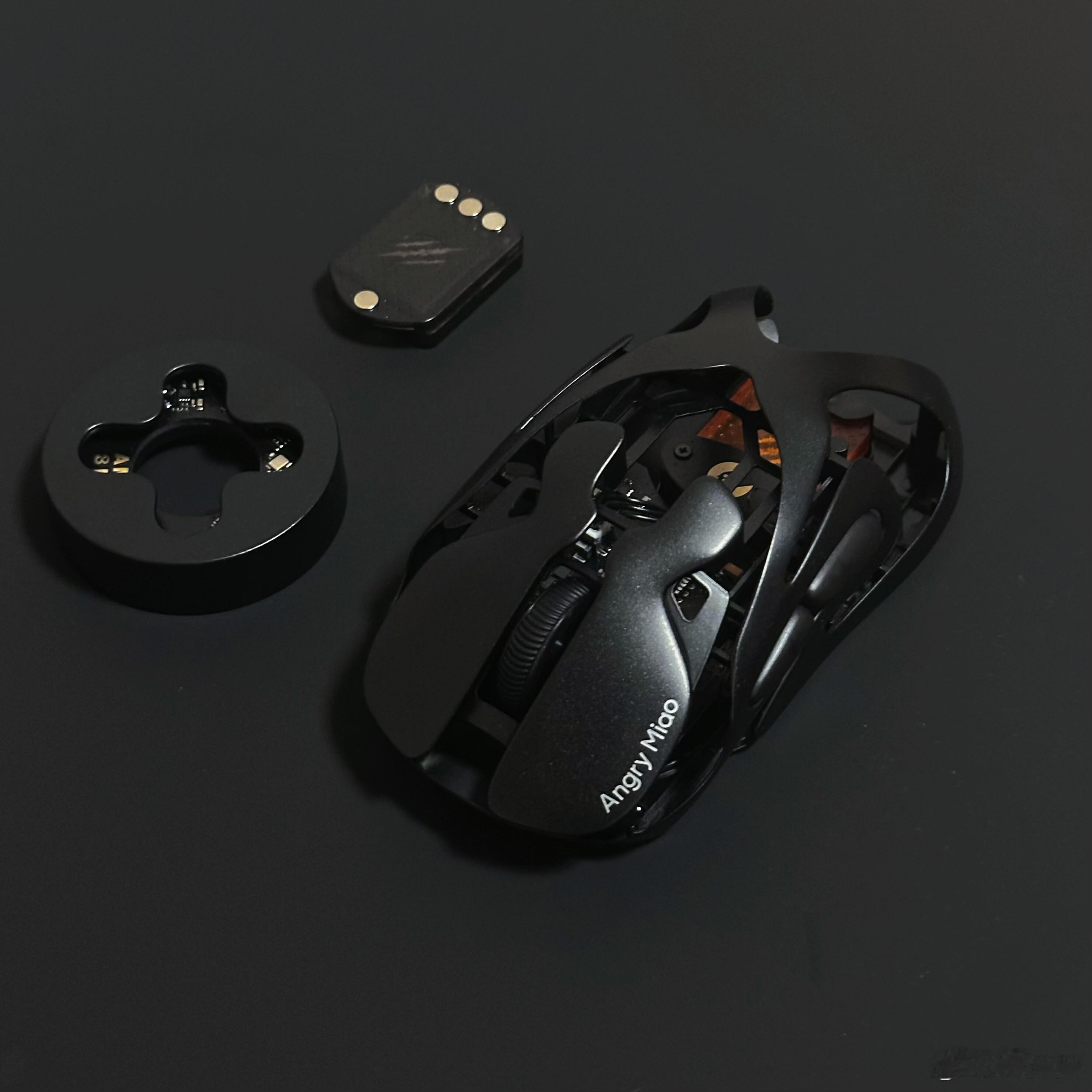 怒喵InfinityMouse鼠标🖱️⚡️设计:采用全镁铝合金镂空骨架,兼顾轻量化(仅49克)与高强度,外观独特且防滑不沾指纹,提供玄武(哑光黑)和霓影(银粉渐变)两种配色。🔋续航:独创热插拔磁吸换电技术,配备双340mAh电池,一块供电时另一块在接收器底座充电,1.2秒即可完成更换,实现“无限续航”。🌟性能:搭载原相PAW3950DM光学传感器,支持1600-30000DPI调节,有线和2.4GHz无线模式下回报率均达8KHz,满足专业电竞需求。✅体验:配备TTC橙点光微动V2,寿命高达一亿次,按键手感清脆;支持RGB灯效自定义,通过AM Master软件可调节按键功能、宏、参数等。