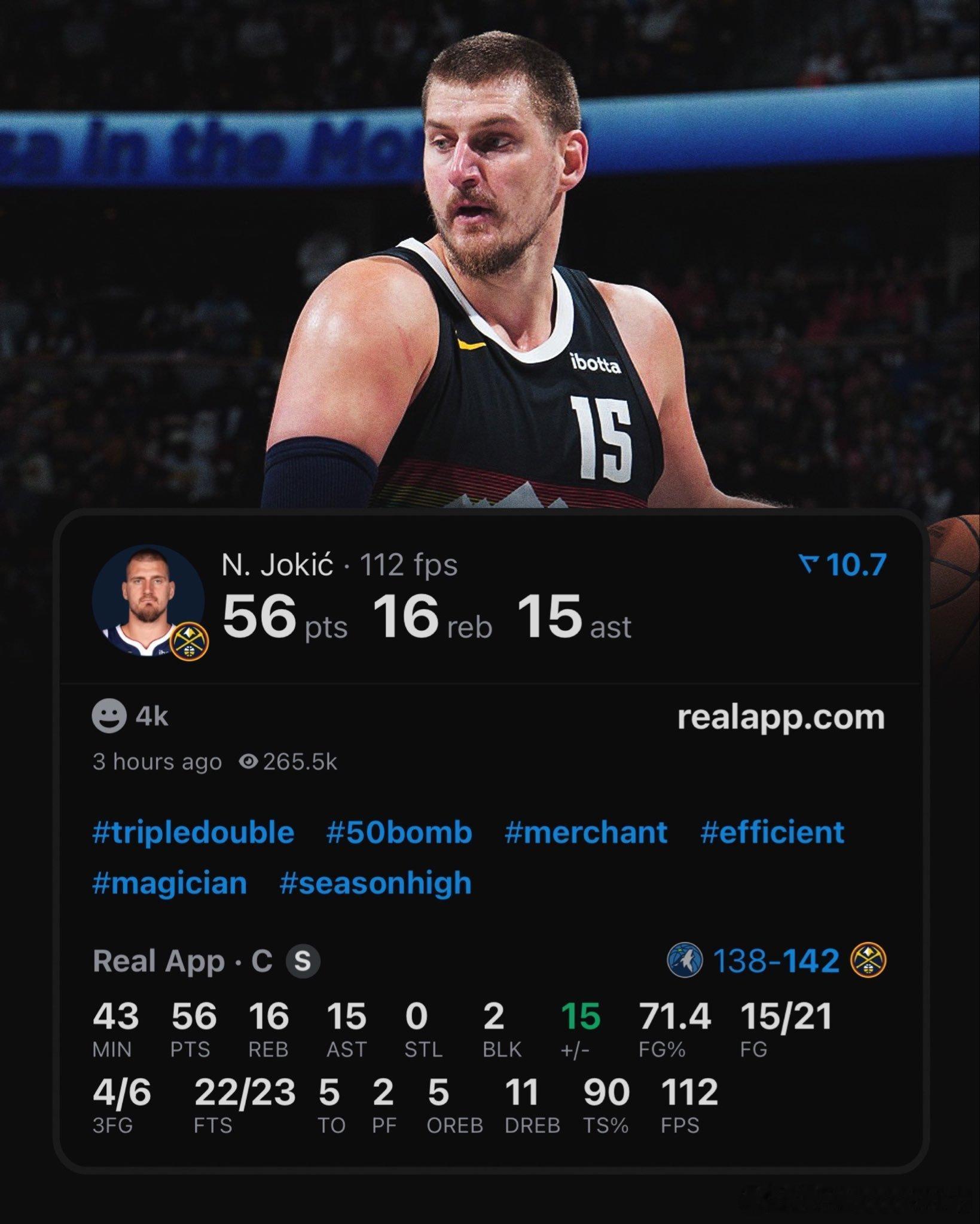 约基奇56分16篮板15助攻约基奇超豪华三双掘金战胜森林狼 联盟现在是四巨头👉詹库杜+约基奇,詹库杜除了能力之外还都是流量圣体,只有约老师是纯靠实力打到了现在的地位🐮,今天打成这样,可以痛快干一瓶可乐庆祝一下了吧!