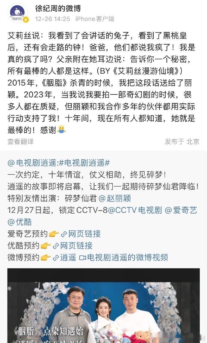 徐纪周回应赵丽颖出演逍遥徐纪周赵丽颖曾合作胭脂徐纪周回应赵丽颖加盟《逍遥》,源于《胭脂》的成功合作,她主动降片酬换创作权,导演盛赞其专业。