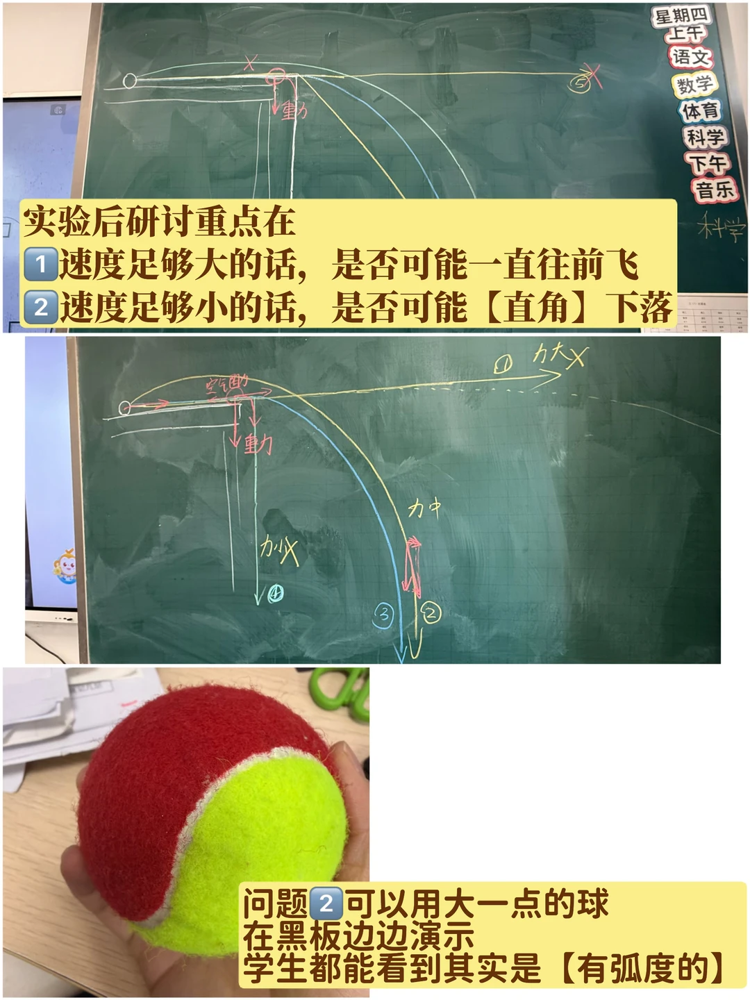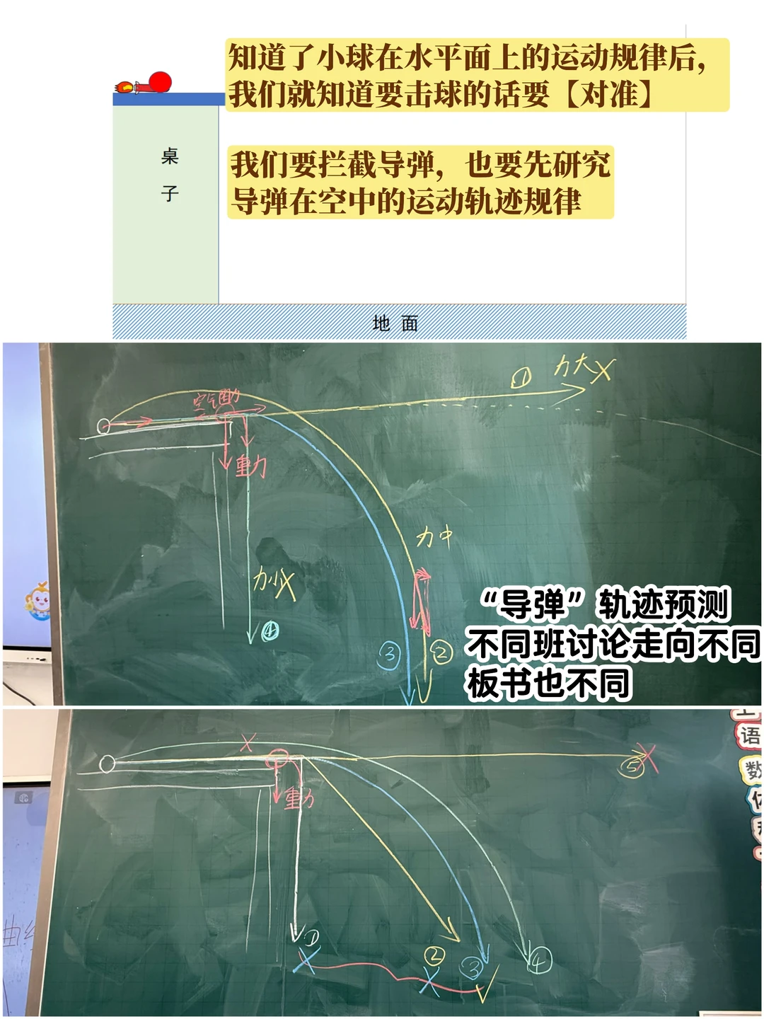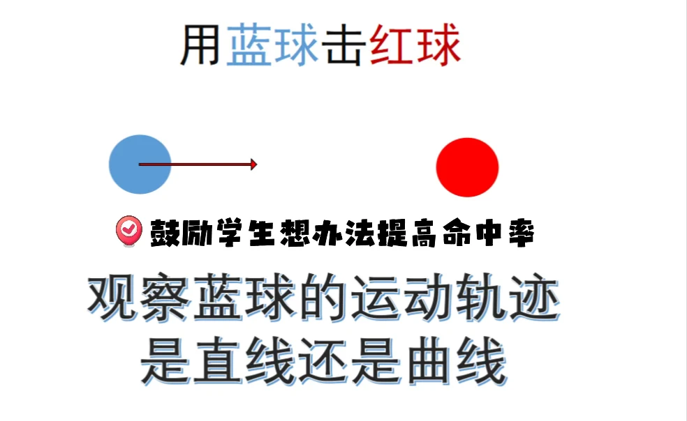 之前跟孟醒老师聊天聊到过这一课 他提到要让学生知道【研究运动轨迹的意义】是什么, 提到了我国运动轨迹无法被预测的钱学森弹道! [黄金薯R]我突然悟了! 原来之前觉得这课简单,是因为只上到了表面! 🔵🔴三年级科学-《直线运动与曲线运动》 (上了两节课) 1️⃣实验一:击球挑战(p2) [爆炸R]发现这里三年级学生和五年级学生的共同点是——会把【折了一下的直线】当【曲线】 [星R][星R]所以研讨时一一列出学生提到的“会走曲线”的情况 再用实验时拍的实况图(转视频)一个个击破! 👦🏻👧🏻:居然都是直线! [集美R]:有没办法让小球在【水平面】上曲线运动? →用轨道【固定运动轨迹】 2️⃣实验二:不同轨道上的运动对比(p7) [集美R]:你在使用两种轨道时,有什么神奇发现? 把问题问“大”!学生能讲很多! 研讨重点: 📍一定会脱轨吗?什么情况会脱轨? 📍为什么在曲线轨道更容易脱轨?怎么预防? [爆炸R][爆炸R]呼应【研究运动轨迹研究的意义】——帮你击球 也可以帮我们【拦截导弹】! 3️⃣“导弹”轨迹预测(把小球假装成导弹了hhh) 📍你认为哪种不可能,为什么? 💣认知冲突集中在: 【速度足够小】时是否可能直接垂直下落? 和【速度足够大】时是否可能直线往前飞? 4️⃣实验三:“导弹拦截”(p11) 5️⃣研讨 🟡【速度足够小】的情况可以用大球演示 ✅解释:小球之所以能掉下来就说明还存在【往前运动】的速度和能量(好多学生上这一课用“能量”来解释👍) 🟡【速度足够大】的情况只能进行【思想实验】 提示:离开桌面小球会受到把它向下拽的重力作用 ❌所以不可能是直线 6️⃣现实中的导弹拦截——【抛物线】 时间够的班在班里还又玩了一次“导弹拦截”, 我抛出“导弹”,学生用另一个“导弹”来击打我的导弹 7️⃣拓:钱学森弹道 正是因为不是常规“抛物线”,而是在空中“打水漂”,轨迹不可预测,是我们的国之重器!