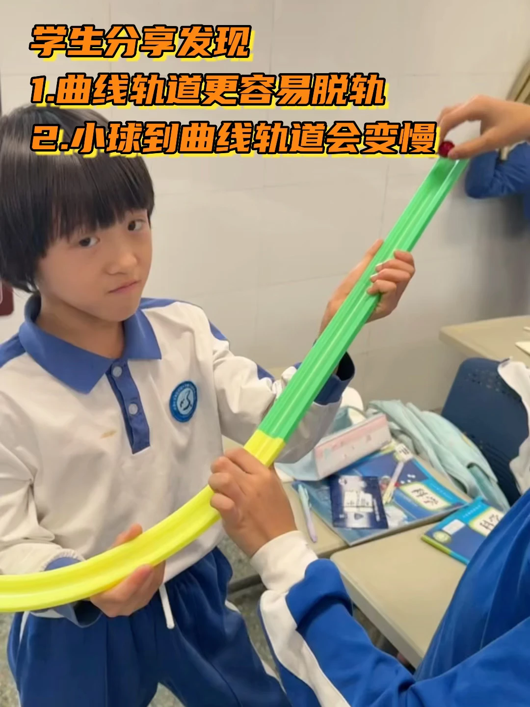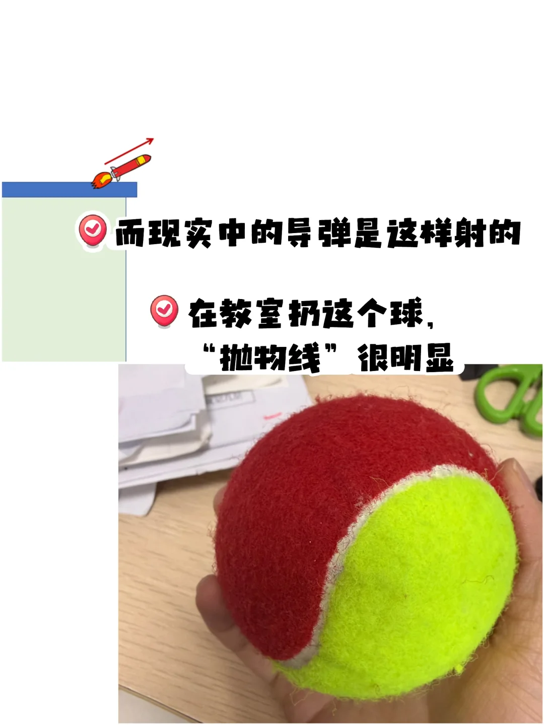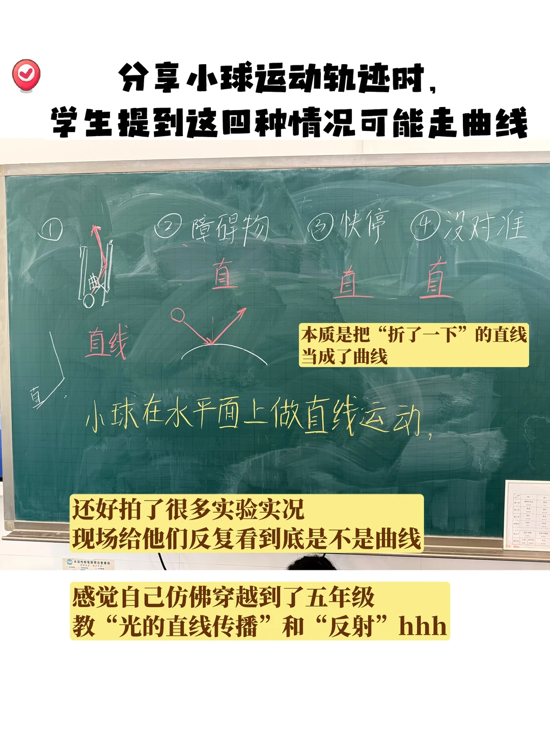 之前跟孟醒老师聊天聊到过这一课 他提到要让学生知道【研究运动轨迹的意义】是什么, 提到了我国运动轨迹无法被预测的钱学森弹道! [黄金薯R]我突然悟了! 原来之前觉得这课简单,是因为只上到了表面! 🔵🔴三年级科学-《直线运动与曲线运动》 (上了两节课) 1️⃣实验一:击球挑战(p2) [爆炸R]发现这里三年级学生和五年级学生的共同点是——会把【折了一下的直线】当【曲线】 [星R][星R]所以研讨时一一列出学生提到的“会走曲线”的情况 再用实验时拍的实况图(转视频)一个个击破! 👦🏻👧🏻:居然都是直线! [集美R]:有没办法让小球在【水平面】上曲线运动? →用轨道【固定运动轨迹】 2️⃣实验二:不同轨道上的运动对比(p7) [集美R]:你在使用两种轨道时,有什么神奇发现? 把问题问“大”!学生能讲很多! 研讨重点: 📍一定会脱轨吗?什么情况会脱轨? 📍为什么在曲线轨道更容易脱轨?怎么预防? [爆炸R][爆炸R]呼应【研究运动轨迹研究的意义】——帮你击球 也可以帮我们【拦截导弹】! 3️⃣“导弹”轨迹预测(把小球假装成导弹了hhh) 📍你认为哪种不可能,为什么? 💣认知冲突集中在: 【速度足够小】时是否可能直接垂直下落? 和【速度足够大】时是否可能直线往前飞? 4️⃣实验三:“导弹拦截”(p11) 5️⃣研讨 🟡【速度足够小】的情况可以用大球演示 ✅解释:小球之所以能掉下来就说明还存在【往前运动】的速度和能量(好多学生上这一课用“能量”来解释👍) 🟡【速度足够大】的情况只能进行【思想实验】 提示:离开桌面小球会受到把它向下拽的重力作用 ❌所以不可能是直线 6️⃣现实中的导弹拦截——【抛物线】 时间够的班在班里还又玩了一次“导弹拦截”, 我抛出“导弹”,学生用另一个“导弹”来击打我的导弹 7️⃣拓:钱学森弹道 正是因为不是常规“抛物线”,而是在空中“打水漂”,轨迹不可预测,是我们的国之重器!