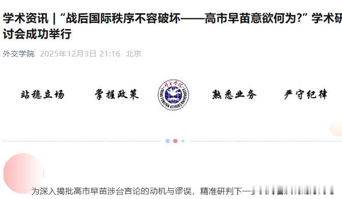 为深入揭批高市早苗涉台言论的动机与谬误,精准研判下一步我对日反制的方向与措施,2025年11月29日,“战后国际秩序不容破坏——高市早苗意欲何为?”学术研讨会在外交学院成功举行。专家学者围绕高市早苗发表谬误言论动因、中日关系法理博弈、反制措施正当性及国际舆情动向等关键议题展开深入研讨,一致认为,高市早苗有关言论严重违背中日四个政治文件精神,严重挑衅中国主权和领土完整,严重伤害中国人民和反法西斯同盟国以及各国人民的情感,严重挑战战后国际秩序,倒行逆施、为军国主义招魂,必须坚决阻击。