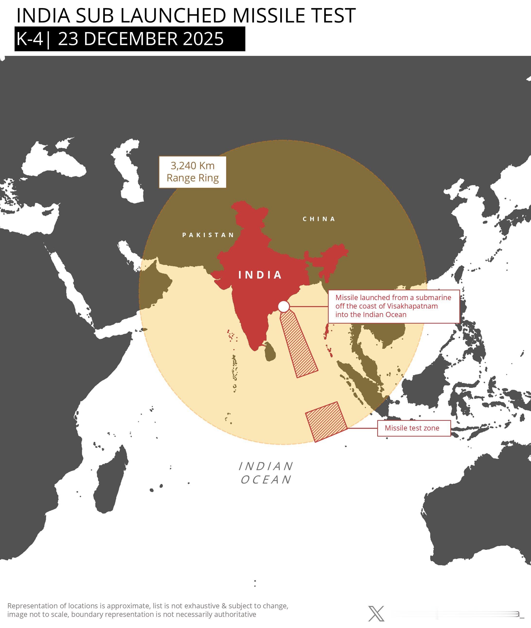 2025年12月23日,印度在孟加拉湾从“歼敌者”号核动力弹道导弹潜艇上成功试射K-4潜射弹道导弹,标志着其在核威慑能力建设上跨越关键门槛,不仅强化了二次打击能力,更重塑了南亚及印太海域的战略格局。