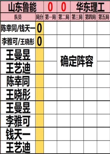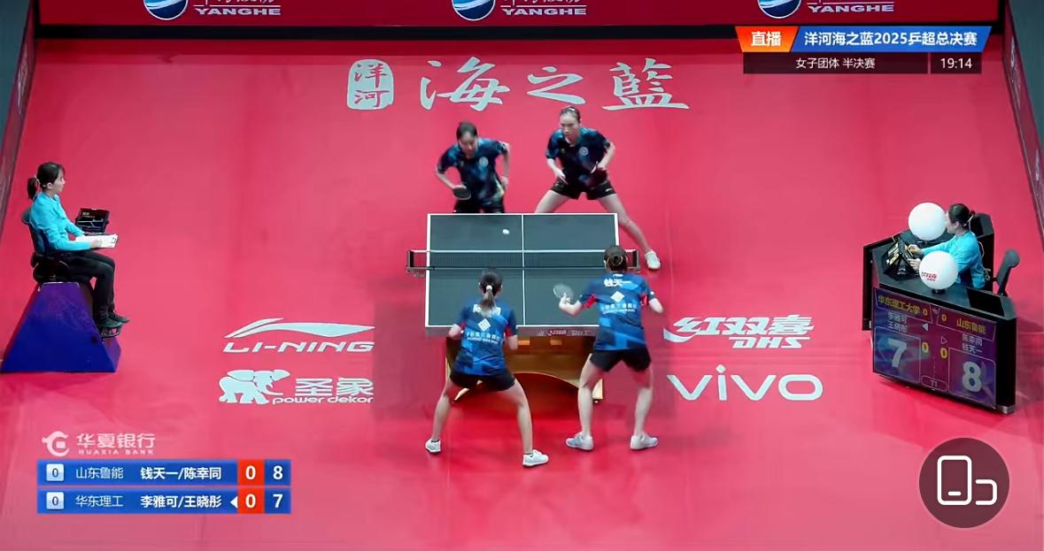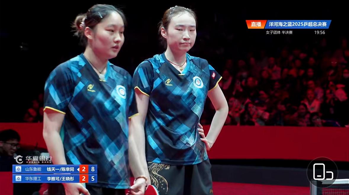 陈幸同/钱天一苦战五局3:2李雅可/王晓彤 艰难拿下第一分! 11:9,7:11,11:13,11:9,11:8 12月26日,乒超联赛女团半决赛, 山东鲁能VS华东理工 第一盘 陈幸同/钱天一3:2李雅可/王晓彤 今天李雅可/王晓彤拼的太凶了, 给陈幸同/钱天一造成严重困难, 钱天一关键分发球失误, 心脏提到嗓子眼! 关键的第四局,陈幸同在关键分 处理的比较好,把比赛拖到决胜局, 陈幸同/钱天一的大赛经验丰富, 关键分的处理更胜一筹,艰难拿下双打,太重要! 第二盘王曼昱VS王艺迪, 最关键的一局, 王曼昱加油, 王艺迪加油! 华东理工如果拼不过双打和第一盘 女单,基本就没有希望啦!