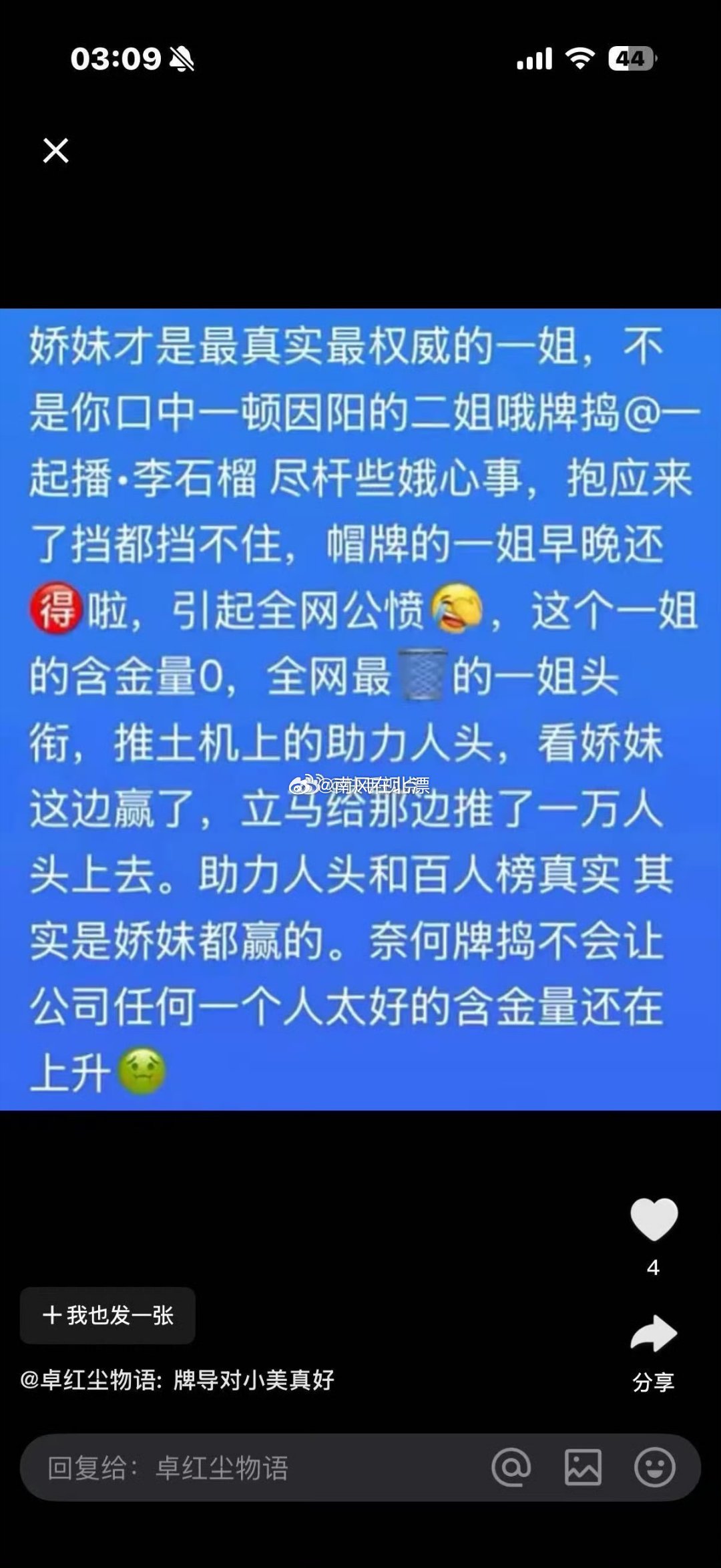娇妹儿.716 你是真忘本啊 !公司给你流量 给你热度 你就是往外送!还引导粉丝骂你老板,517的粉丝别骂了 你爱播卖货呢 多买点不行么?还有你就是这种连自己妈妈生病都不管 也要去别人生日会唱歌跳舞 还请朋友家里过圣诞节 的人 怎么会有人情世故 生日只收礼不还礼 卖货别人只帮你 你又不帮别人 垃圾 好好引导粉丝 别再骂pz了