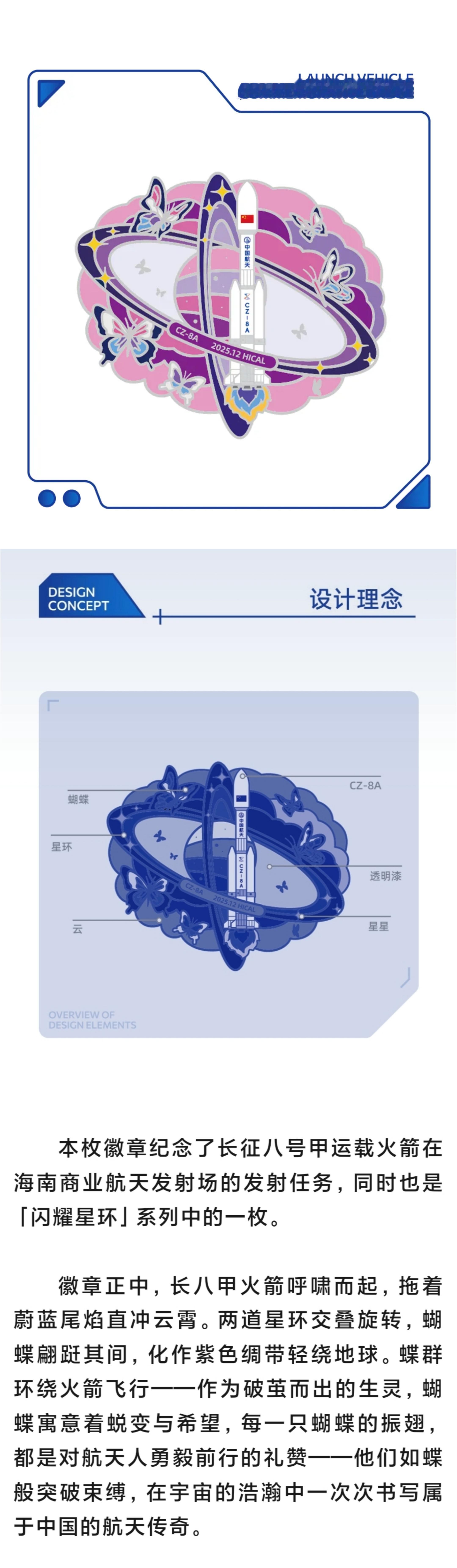 2025年12月26日7时26分海南商业航天发射场1号工位长征八号甲遥六运载火箭成功卫星互联网低轨17组卫星大红屏和任务徽章卫星互联网低轨17组卫星由中国航天科技集团有限公司五院抓总研制长八甲火箭由航天科技集团一院抓总研制,是我国自主研制的两级半状态液体运载火箭,芯一级为直径3.35米的液氧煤油模块,芯二级为直径3.35米的氢氧模块,捆绑2个液体助推器,采用5.2米直径整流罩。全箭总长约50.5米,起飞重量约371吨本次任务是长八甲火箭第6次发射,也是长征八号系列火箭的第10次发射。长八甲火箭于今年2月首飞,首飞之年即迎来高密度发射,六战六捷,充分展现了其作为新一代中型运载火箭的高可靠性、高适应性与快速履约能力❶2025年度中国航天第89次发射(87次成功)❷长征八号甲运载火箭第6次发射(6次成功)❸长征八号系列运载火箭第10次发射(10次成功)❹长征系列运载火箭第620次发射(603次成功)❺海南商业航天发射场第10次发射(10次成功)❻中国航天第730次发射(692次成功)