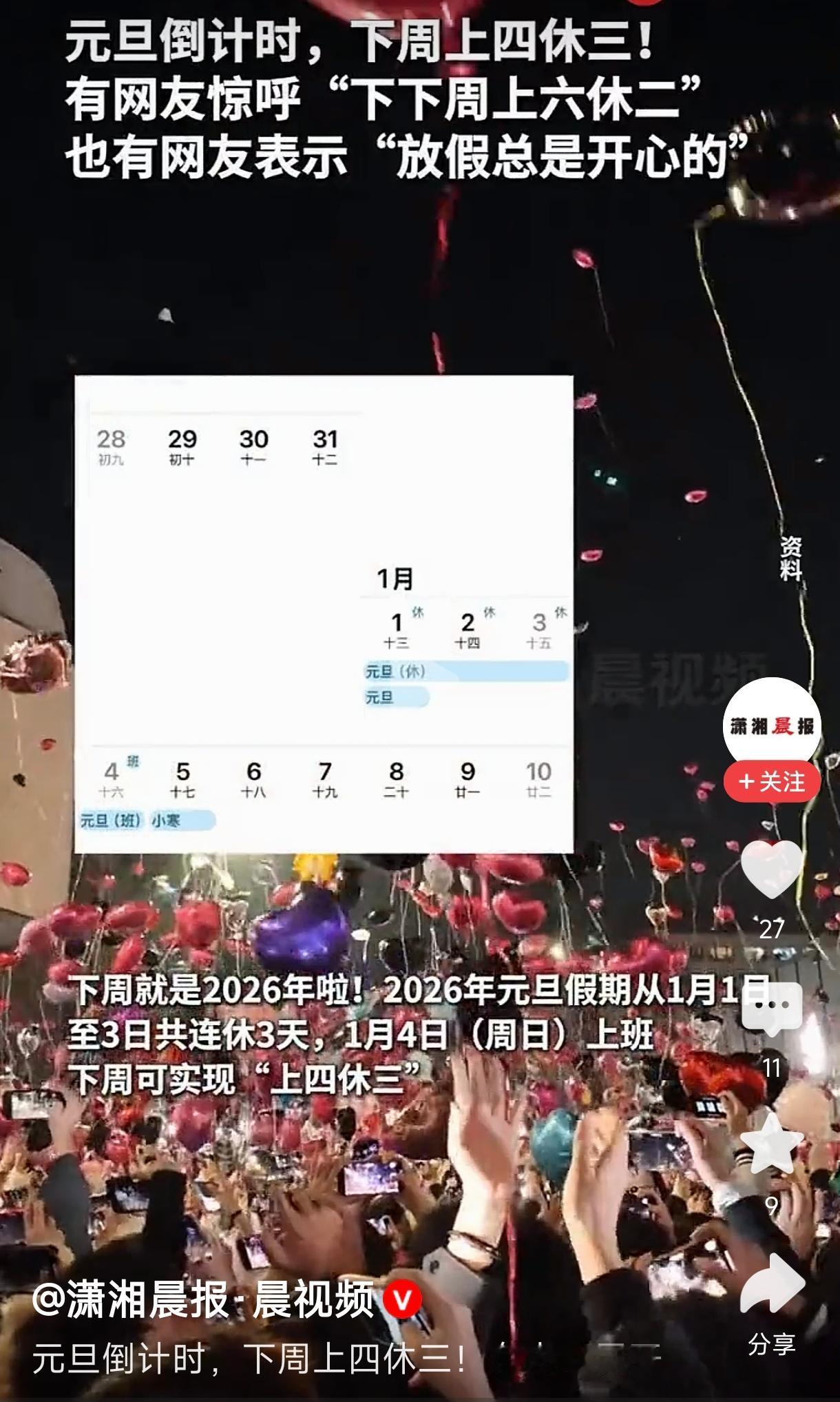下周上四休三 这则消息提到“元旦倒计时,下周上四休三”,意味着在元旦假期前的一周,工作安排为连续工作四天,然后休息三天。这种安排可以让员工在节日前有一个较长的休息时间,缓解工作压力,也方便提前安排节日准备。 有人调侃“下下周上六休二”,可能是因为之后的假期安排更为宽松,甚至有人觉得“放假总是开心的”,体现出大家对假期的期待和喜悦。 整体来看,这反映了近期工作与休息安排的调整,可能是为了应对节假日的需要,也显示出人们对休假生活的期待。元旦调休