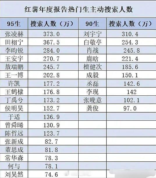 红薯的年度报告热门生主动搜索人数排行榜来了,排名前三分别是张凌赫、田栩宁、李昀锐,都是当红流量小生,有机会更上一层楼啊