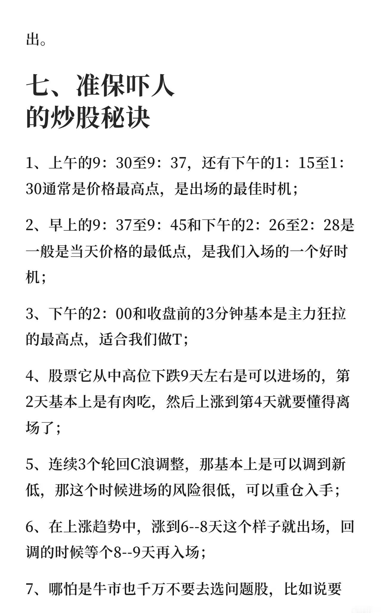 股票投资(尤其短线交易)的技巧: “做短线必须注意”的十条卖出纪律,包括超7个点不涨停、低开超3个点、高开后快速下杀破均线、盘中放量滞涨、尾盘半小时内大幅跳水、连续两日收阴线跌破重要支撑位、大单持续流出且股价走弱、早盘冲高后无法创新高、换手率突然异常放大、盘中触及跌停等情况均需卖出,强调短线操作中止盈止损与规避风险的重要性。 “准保吓人的炒股秘诀”,涉及交易时段与策略:上午9:30-9:37、下午1:15-1:30是出场最佳时机;早上9:37-9:45、下午2:26-2:28通常是当日价格最低点,适合入场;下午2:00和收盘前3分钟多为“主力狂拉的最高点”,适合做T;股票从中高位下跌9天左右可进场(次日易获利),上涨至第4天需离场;连续3个轮回C浪调整后风险低可重仓;上涨趋势中涨6-8天出场,回调8-9天再入场;牛市也不选问题股。