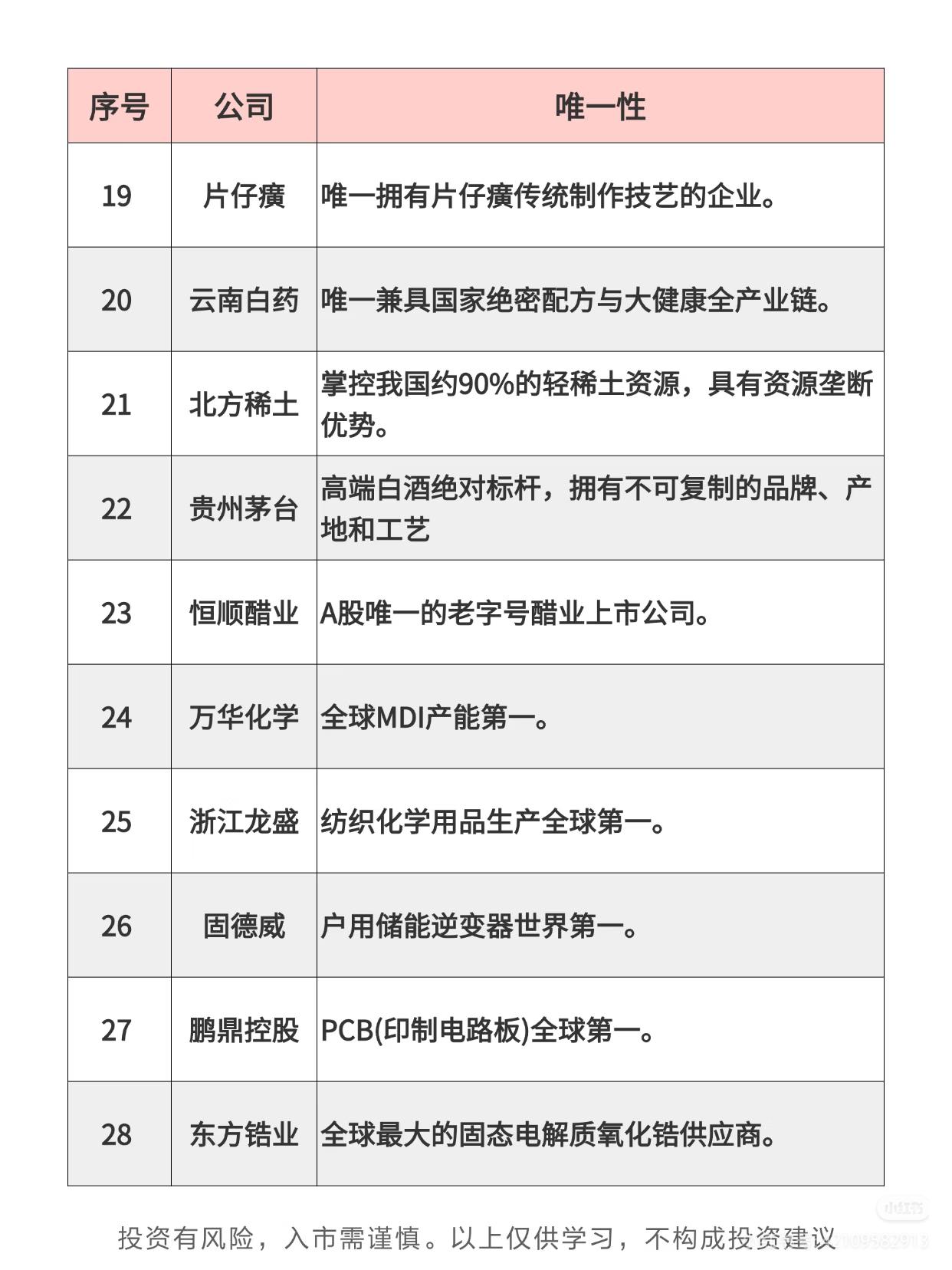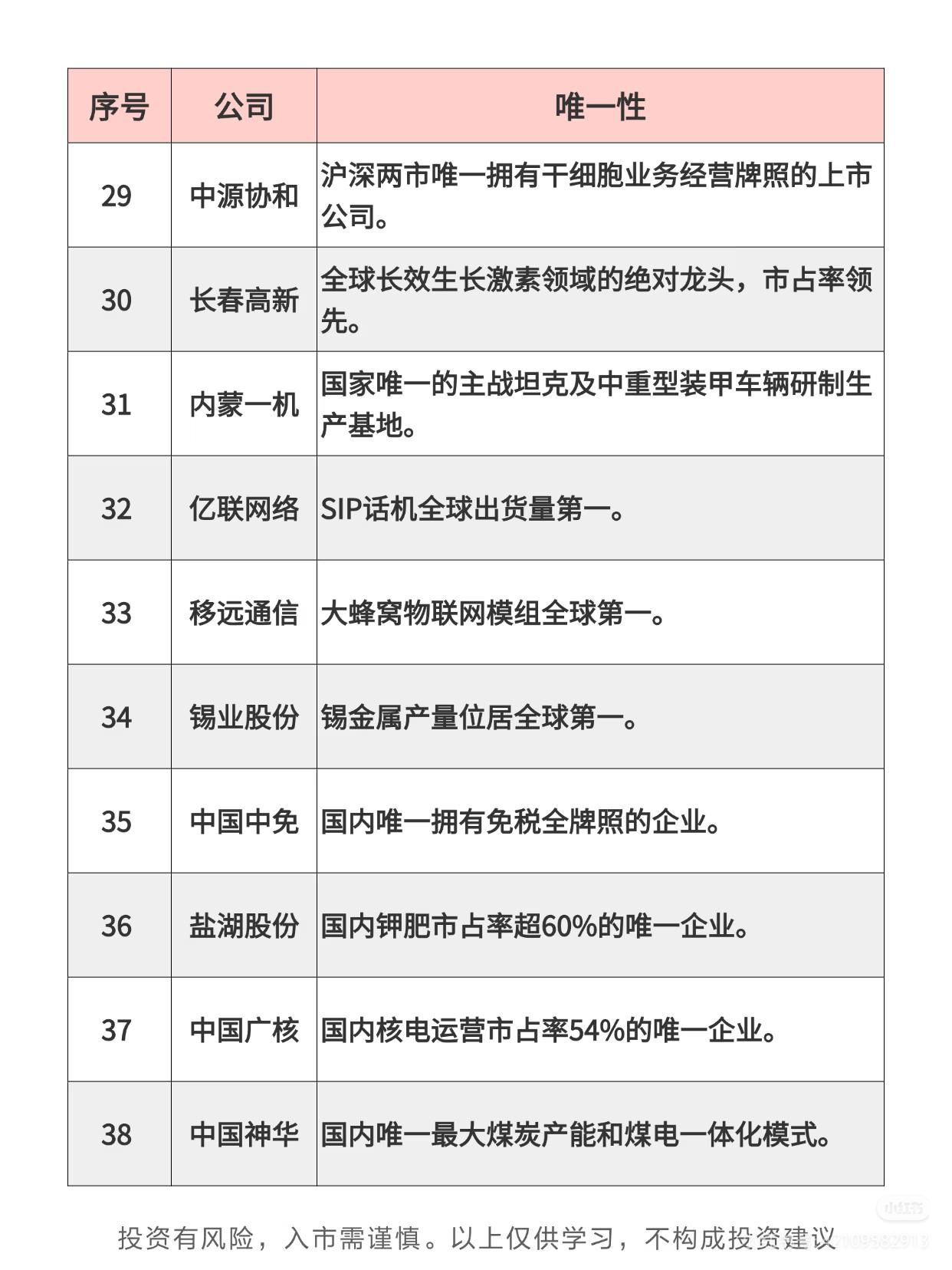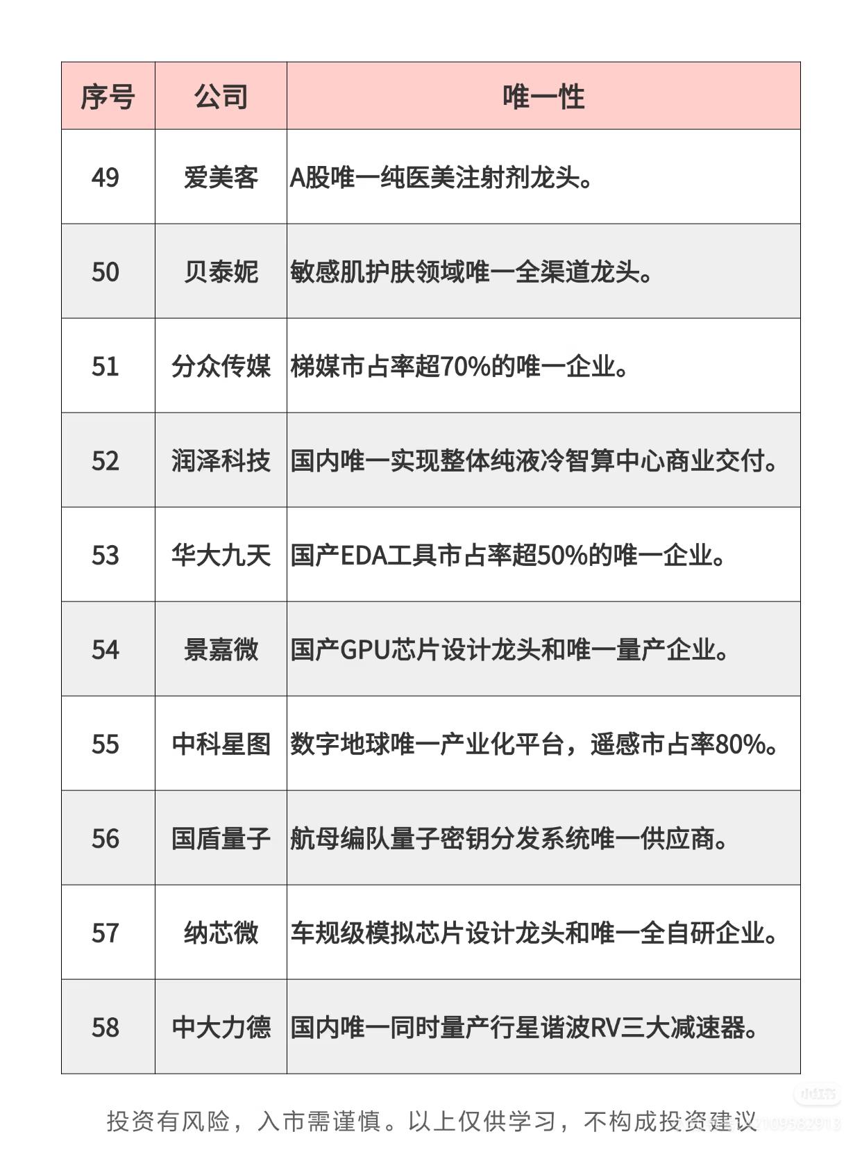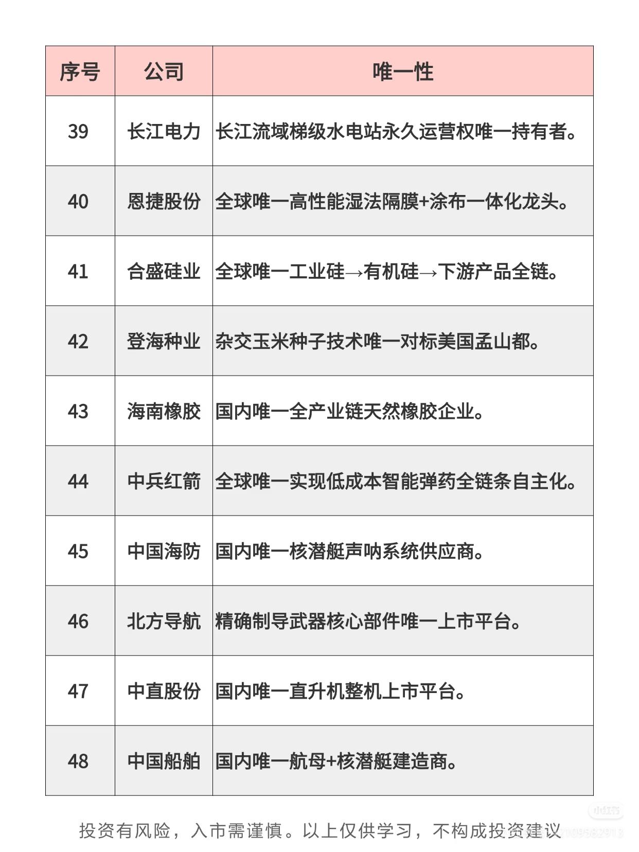 A股58家被称为“唯一龙头”的企业及其核心独特性,具体如下: 1. 寒武纪:云端AI芯片唯一自主架构,算力全球前三; 2. 中科曙光:中国超算行业龙头,液冷数据中心领导者; 3. 中芯国际:国内规模最大、技术最先进的芯片制造企业; 4. 金山办公:国产办公软件市占率第一的唯一企业; 5. 澜起科技:DDR5芯片全球市占率46%的唯一中国企业; 6. 中微公司:国内唯一5nm刻蚀设备制造商; 7. 科大讯飞:中文语音技术全球领先的唯一企业; 8. 中航沈飞:国内唯一上市的战斗机整机制造商; 9. 航发动力:国内唯一覆盖全谱系军用航空发动机总装龙头; 10. 航天彩虹:国内唯一连续十年无人机出口量前三企业; 11. 高德红外:国内唯一覆盖红外探测器芯片、热成像整机及武器系统全产业链企业; 12. 光启技术:国内唯一实现超材料隐身涂层量产企业; 13. 中航西飞:国内唯一大型军用运输机(运-20)整机制造商; 14. 航天电子:唯一覆盖火箭、卫星、导弹全系宇航电子系统供应; 15. 恒瑞医药:国内唯一拥有19款1类创新药上市; 16. 药明康德:全球唯一端到端CRDMO平台; 17. 迈瑞医疗:国内唯一覆盖生命信息支持全场景医疗设备; 18. 联影医疗:国内唯一量产5.0T超高端磁共振设备; 19. 片仔癀:唯一拥有片仔癀传统制作技艺的企业; 20. 云南白药:唯一兼具国家绝密配方与大健康全产业链; 21. 北方稀土:掌控我国约90%的轻稀土资源,具有资源垄断优势; 22. 贵州茅台:高端白酒绝对标杆,拥有不可复制的品牌、产地和工艺; 23. 恒顺醋业:A股唯一的老字号醋业上市公司; 24. 万华化学:全球MDI产能第一; 25. 浙江龙盛:纺织化学用品生产全球第一; 26. 固德威:户用储能逆变器世界第一; 27. 鹏鼎控股:PCB(印制电路板)全球第一; 28. 东方锆业:全球最大的固态电解质氧化锆供应商; 29. 中源协和:沪深两市唯一拥有干细胞业务经营牌照的上市公司; 30. 长春高新:全球长效生长激素领域的绝对龙头,市场占有率领先; 31. 内蒙一机:国家唯一的主战坦克及中重型装甲车辆研制生产基地; 32. 亿联网络:SIP话机全球出货量第一; 33. 移远通信:大蜂窝物联网模组全球销量第一; 34. 锡业股份:锡金属年产量位居全球首位; 35. 中国中免:国内唯一持有完整免税业务牌照的企业; 36. 盐湖股份:国内钾肥市场占有率超过60%的唯一企业; 37. 中国广核:国内核电运营市场份额达到54%的唯一企业; 38. 中国神华:国内唯一拥有最大煤炭产能并采用煤电一体化运营模式的企业; 39. 长江电力:长江流域梯级水电站永久运营权唯一持有者; 40. 恩捷股份:全球唯一高性能湿法隔膜+涂布一体化龙头; 41. 合盛硅业:全球唯一工业硅→有机硅→下游产品全链; 42. 登海种业:杂交玉米种子技术唯一对标美国孟山都; 43. 海南橡胶:国内唯一全产业链天然橡胶企业; 44. 中兵红箭:全球唯一实现低成本智能弹药全链条自主化; 45. 中国海防:国内唯一核潜艇声呐系统供应商; 46. 北方导航:精确制导武器核心部件唯一上市平台; 47. 中直股份:国内唯一直升机整机上市平台; 48. 中国船舶:国内唯一航母+核潜艇建造商; 49. 爱美客:A股唯一纯医美注射剂龙头; 50. 贝泰妮:敏感肌护肤领域唯一全渠道龙头; 51. 分众传媒:梯媒市占率超70%的唯一企业; 52. 润泽科技:国内唯一实现整体纯液冷智算中心商业交付; 53. 华大九天:国产EDA工具市占率超50%的唯一企业; 54. 景嘉微:国产GPU芯片设计龙头和唯一量产企业; 55. 中科星图:数字地球唯一产业化平台,遥感市占率80%; 56. 国盾量子:航母编队量子密钥分发系统唯一供应商; 57. 纳芯微:车规级模拟芯片设计龙头和唯一全自研企业; 58. 中大力德:国内唯一同时量产行星、谐波、RV三大减速器。 注:投资有风险,入市需谨慎。以上信息仅供学习,不构成投资建议。