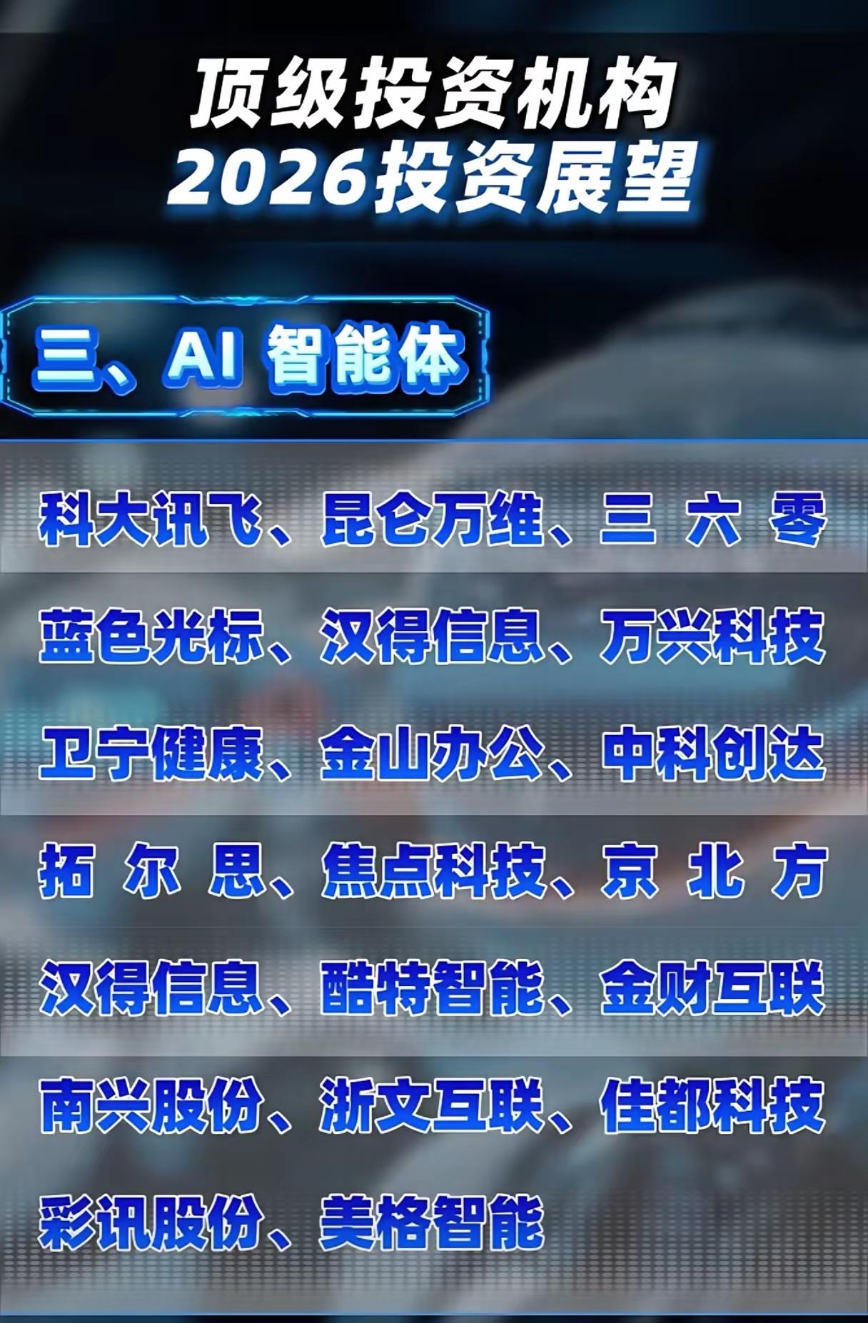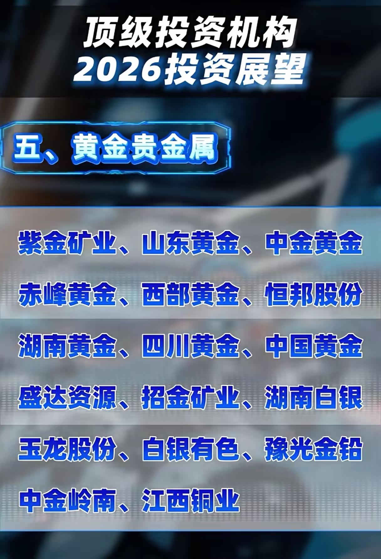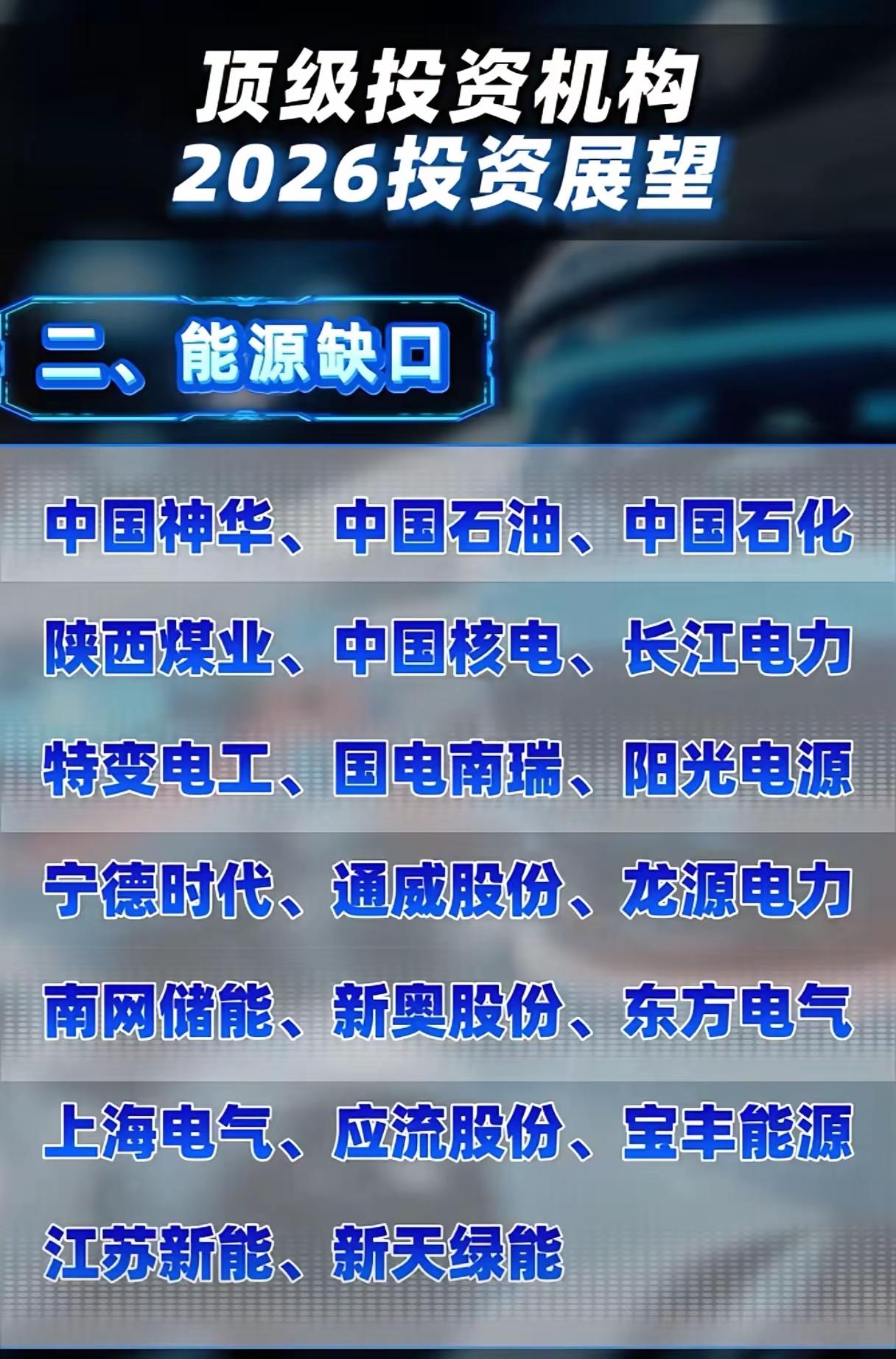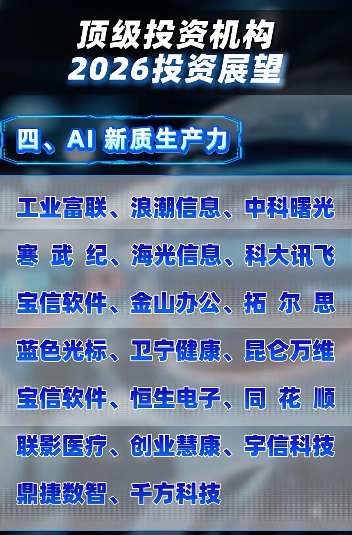 顶级投资机构2026投资展望涵盖五大核心领域,各领域聚焦不同方向的优质企业。 一是AI基建,重点关注人工智能基础设施相关企业,包括浪潮信息、中科曙光、工业富联、紫光股份、寒武纪、海光信息、英维克、光环新网、数据港、润泽科技、拓维信息、中际旭创、光迅科技、锐捷网络、宝信软件、奥飞数据、杭钢股份、鸿博股份、科华数据、申菱环境等。 二是能源缺口,围绕能源领域布局,涉及中国神华、中国石油、中国石化、陕西煤业、中国核电、长江电力、特变电工、国电南瑞、阳光电源、宁德时代、通威股份、龙源电力、南网储能、新奥股份、东方电气、上海电气、应流股份、宝丰能源、江苏新能、新天绿能等企业。 三是AI智能体,聚焦人工智能智能体赛道,包含科大讯飞、昆仑万维、三六零、蓝色光标、汉得信息、万兴科技、卫宁健康、金山办公、中科创达、拓尔思、焦点科技、京北方、酷特智能、金财互联、南兴股份、浙文互联、佳都科技、彩讯股份、美格智能等公司(其中汉得信息重复提及)。 四是AI新质生产力,关注人工智能驱动的新质生产力方向,覆盖工业富联、浪潮信息、中科曙光、寒武纪、海光信息、科大讯飞、宝信软件、金山办公、拓尔思、蓝色光标、卫宁健康、昆仑万维、恒生电子、同花顺、联影医疗、创业慧康、宇信科技、鼎捷数智、千方科技等企业(其中宝信软件重复提及)。 五是黄金贵金属,针对黄金及贵金属领域,列出紫金矿业、山东黄金、中金黄金、赤峰黄金、西部黄金、恒邦股份、湖南黄金、四川黄金、中国黄金、盛达资源、招金矿业、湖南白银、玉龙股份、白银有色、豫光金铅、中金岭南、江西铜业等相关企业。