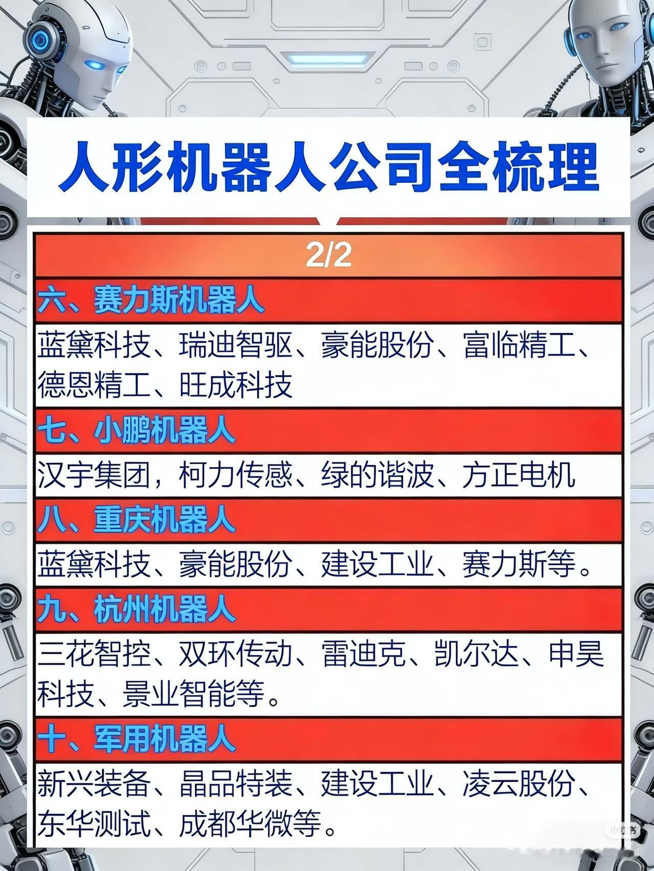 “人形机器人公司全梳理”,按品牌或类型划分,系统整理了与人形机器人相关的企业名单。 第一张图主要介绍了五大类: - 英伟达机器人涉及东方精工、搏杰股份、阿尔特、奥比中光、九号公司、天准科技、麦格米特、伟创电气、海晨股份、长盛轴承等企业; - 华为机器人包括拓斯达、禾川科技、科力尔、中坚科技、埃夫特、兆威机电、富临精工; - 宁德时代机器人有爱仕达、东杰智能、通力科技、科大智能、埃斯顿、大恒科技; - 长安机器人涵盖长安汽车、天奇股份、三丰智能、东安动力; - 特斯拉机器人则包括晋拓股份、昊志机电、中大力德、雷赛智能、绿的谐波。 第二张图延续梳理,补充了另外五类: - 赛力斯机器人关联的包括蓝黛科技、瑞迪智驱、豪能股份、富临精工、德恩精工、旺成科技; - 小鹏机器人有汉宇集团、柯力传感、绿的谐波、方正电机; - 重庆机器人列出蓝黛科技、豪能股份、建设工业、赛力斯等; - 杭州机器人包含三花智控、双环传动、雷迪克、凯尔达、申昊科技、景业智能等; - 军用机器人涉及新兴装备、晶品特装、建设工业、凌云股份、东华测试、成都华微等。 整体来看,这份梳理覆盖了国内外多家知名科技企业及产业链相关公司,涉及消费电子、新能源汽车、智能制造、军工等多个领域,反映出人形机器人产业当前多元化和跨行业融合的发展趋势。