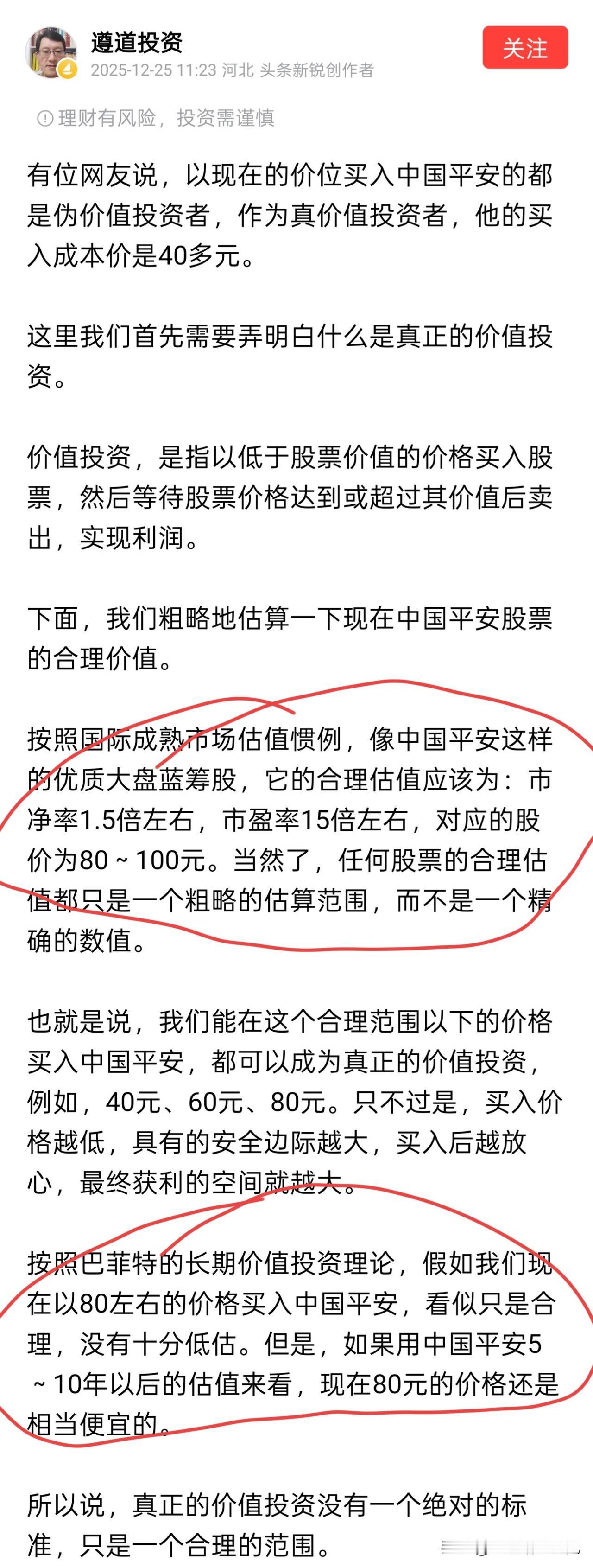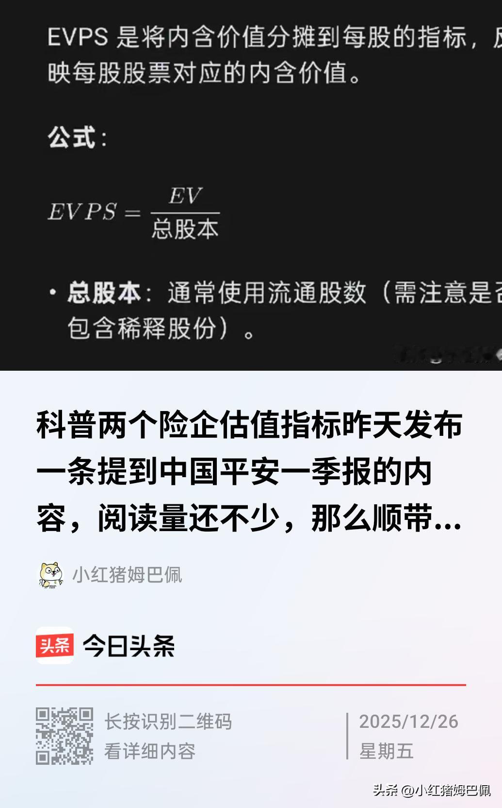 再带大家重温一下保险股的估值方法 首先可以看看这位夸利润连年下跌的民生银行“不断顽强创造奇迹并且成长性高于大部分小银行”的“真盗投资”(图2),对于平安又发表了什么高论(图1): 1、“国际市场成熟惯例,市盈率多少市净率多少”,我真的忍不住爆粗口,成熟nm个惯例,市盈nm个头!保险股用PE估值能准?任何行业,任何资本结构的企业,任何成长性差异的企业,在垃圾自媒体眼里只有统一的一把尺,分析你个头分析! 2、“用平安5-10年后的估值来看,现在平安很便宜”。nm连估值方法都不懂,还5-10年后的估值?!要都拿5-10年后的估值来看,你怎么知道10年后某家芯片企业,人工智能企业不便宜?随口就是一句5-10年,还要给巴菲特泼脏水。不是我说什么,不但不懂保险股如何估值,你让他算平安哪怕3年后的业绩,算内在价值,他算得出个鬼! 对于这么垃圾的号和输出的内容,坑害普通散户,我真的是出离愤怒,每天都是虚构xx网友的股市xx网友提问来骗流量,多么不堪智商的投资者才会向你提问?!向你提问是倒了八辈子的血霉! 当然,除了抨击垃圾和忍不住骂人外,还是要给大家一点干货让大家学到一些东西,具体大家可以参考我在今年5月的一篇科普文(图3),其中明确告诉大家保险公司的估值,应当采用负债端+资产端双重评估。原因是保险业务的核心承担风险(负债),并通过投资(资产)获取收益,需同时评估保单负债的未来现金流和投资资产的公允价值。 同时还要以内含价值为核心估值,原因是保险利润释放周期长(保单可能跨越几 十年),需用内含价值(EV)替代传统净资产或盈利指标。并进一步给大家列出来EVPS和P/EV估值的公式和示例。 也有朋友问我,现在平安的价格有20%的盈利,是去是留,说实话,脱离了你自己的家庭资产情况,抗风险能力,风险偏好,以及投资组合里其他资产的相关性,和来股市的目的(快速致富、稳健增值or持股收息),这个问题是无法回答的。 我只能说,近期平安的股价已经基本反应了市场对保险业的乐观情绪,但是如果你是收息且还想持有3年以上,那还有空间。