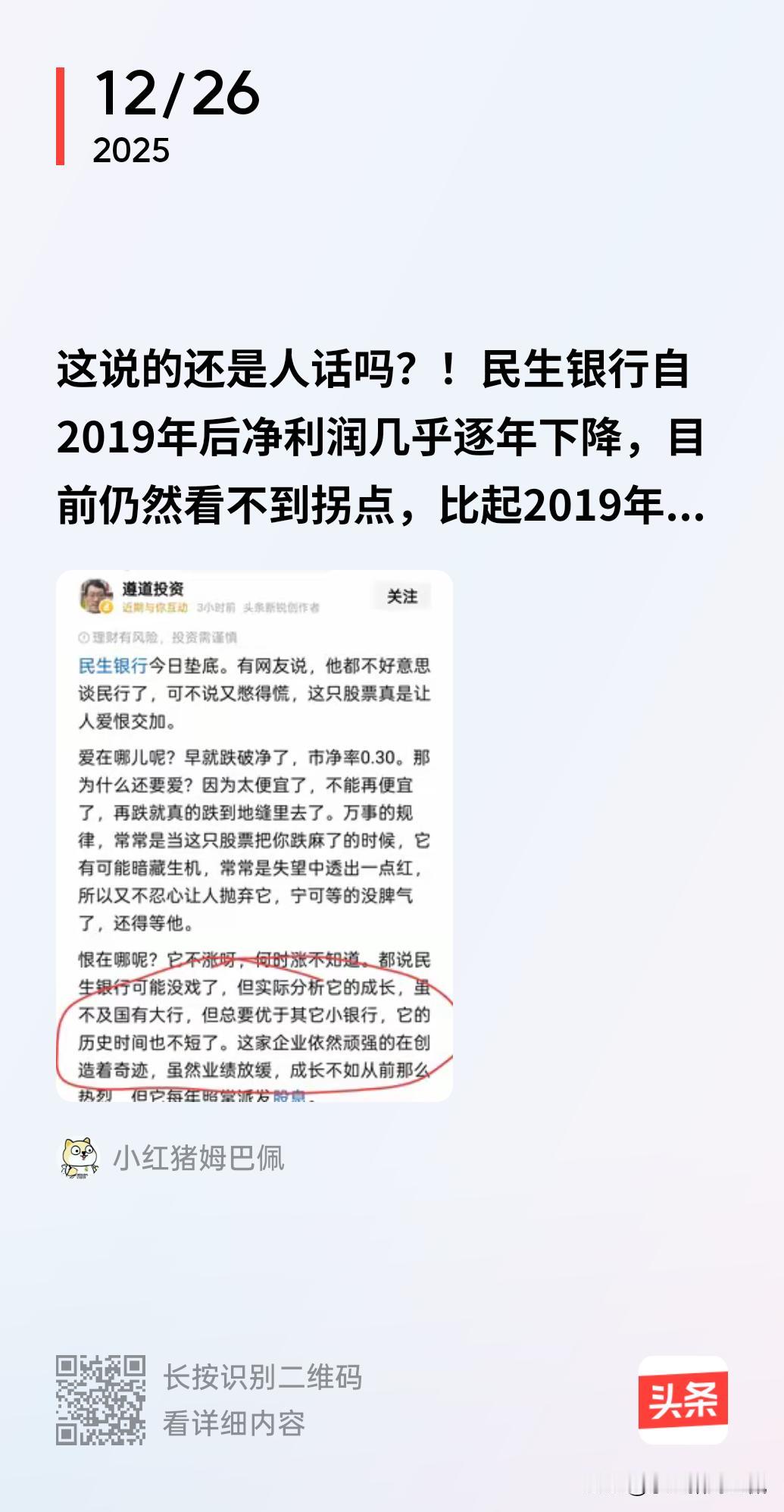 再带大家重温一下保险股的估值方法 首先可以看看这位夸利润连年下跌的民生银行“不断