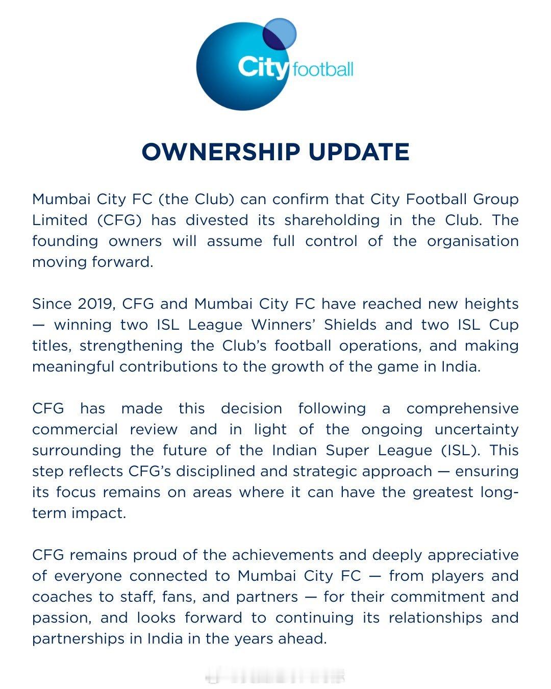 【印度足球】城市足球集团官方确认,集团已经出售其拥有的孟买城足球俱乐部的股份:“CFG在进行全面的商业评估后,考虑到印度超级足球联赛未来持续存在的不确定性,做出(出售股份)这一决定。”曼城 印度