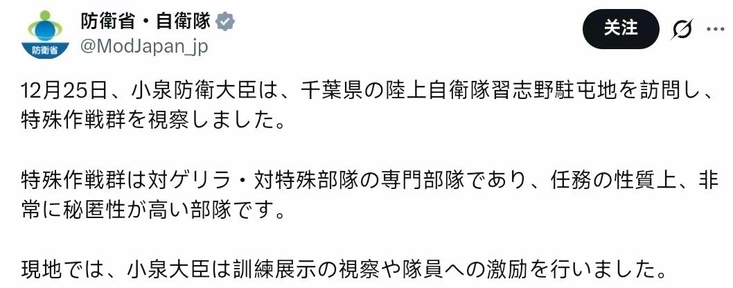 12月25日,日本防卫省发布消息称,日本防卫大臣小泉进次郎访问千叶县陆上自卫队习