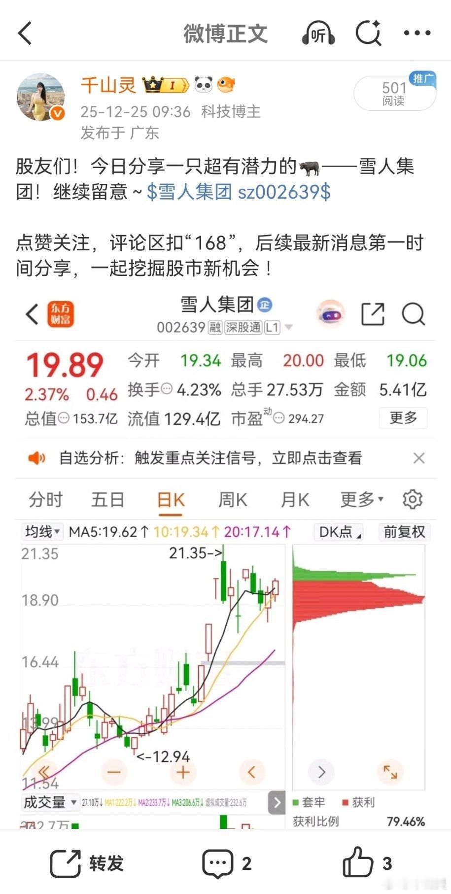 废话不多说,玩的就是真实!昨天分享的$雪人集团 sz002639$ 今日延续强势、再度大涨,节奏精准踩实!时间是最好的老师,实力见证每一次预判!欢迎大家关注,后续更多节奏研判,持续奉上!