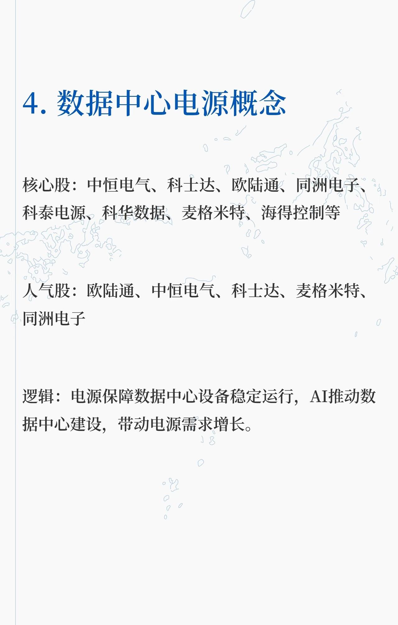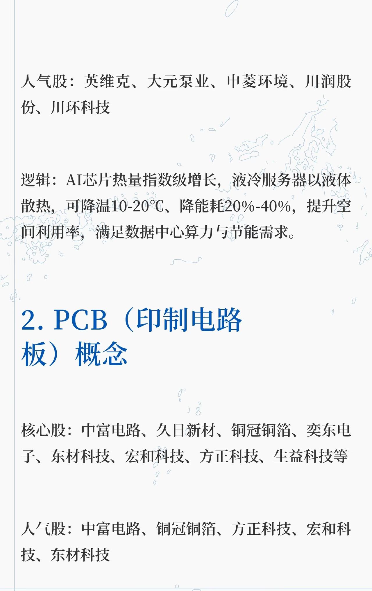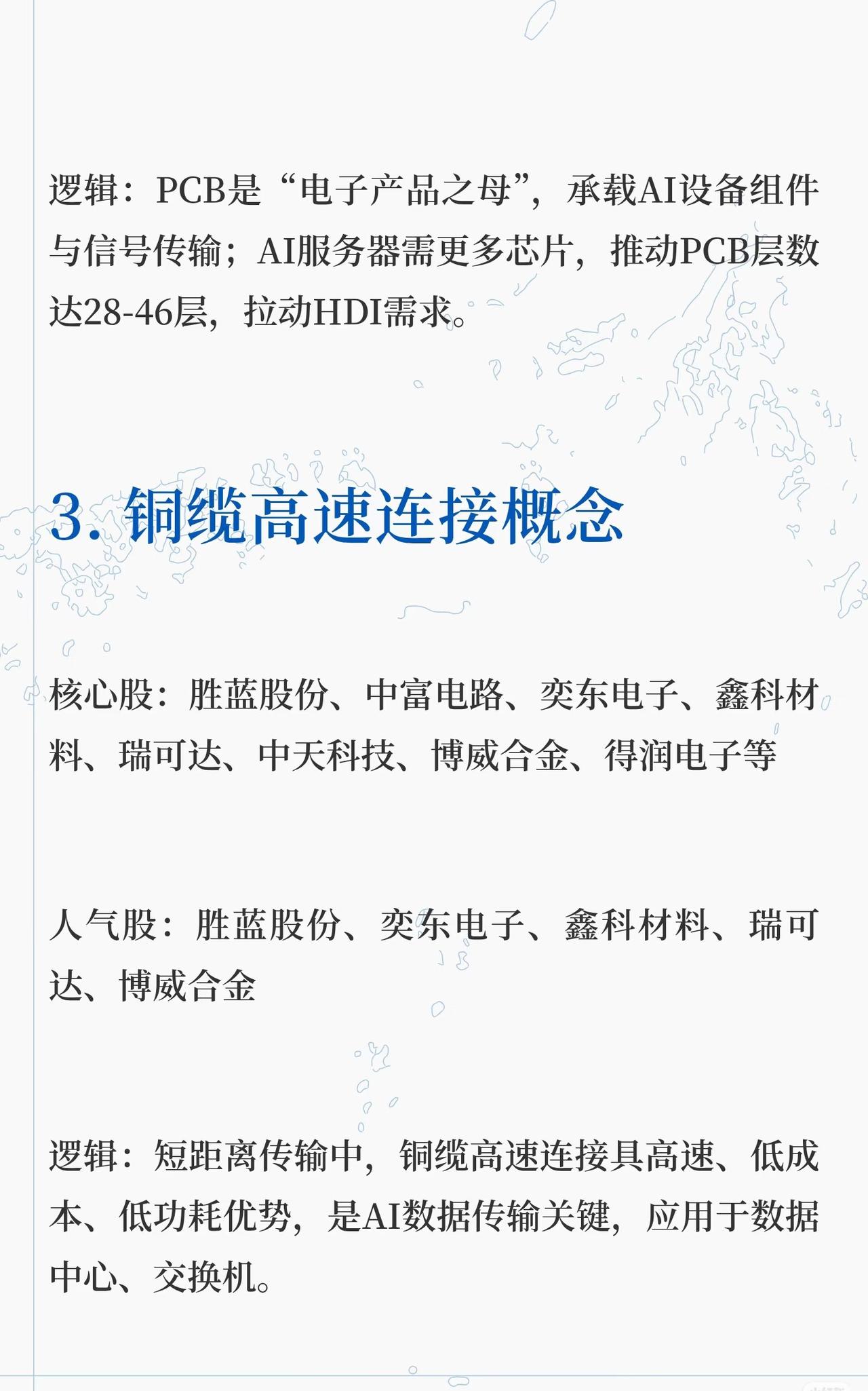 AI算力硬件产业链的4大细分领域: 首先是液冷服务器概念,核心股包括川环科技、溯联股份、强瑞技术、润禾材料、英维克、大元泵业、盾安环境、川润股份等,人气股有英维克、大元泵业、申菱环境、川润股份、川环科技;其逻辑在于AI芯片热量呈指数级增长,液冷服务器通过液体散热可实现降温10-20℃、降低能耗20%、提升空间利用率,能满足数据中心对算力与节能的双重需求。 其次是PCB(印制电路板)概念,核心股有中富电路、久日新材、铜冠铜箔、奕东电子、东材科技、宏和科技、方正科技、生益科技等,人气股包括中富电路、铜冠铜箔、方正科技、宏和科技、东材科技;逻辑是PCB作为“电子产品之母”,负责承载AI设备组件与信号传输,而AI服务器需搭载更多芯片,推动PCB层数提升至28-46层,进而拉动HDI需求。 第三是铜缆高速连接概念,核心股涵盖胜蓝股份、中富电路、奕东电子、鑫科材料、瑞可达、中天科技、博威合金、得润电子等,人气股为胜蓝股份、奕东电子、鑫科材料、瑞可达、博威合金;其优势在于短距离传输中具备高速、低成本、低功耗特点,是AI数据传输的关键技术,主要应用于数据中心、交换机等场景。 最后是数据中心电源概念,核心股包括中恒电气、科士达、欧陆通、同洲电子、科泰电源、科华数据、麦格米特、海得控制等,人气股有欧陆通、中恒电气、科士达、麦格米特、同洲电子;逻辑是电源保障数据中心设备稳定运行,AI发展推动数据中心建设加速,进而带动电源需求增长。