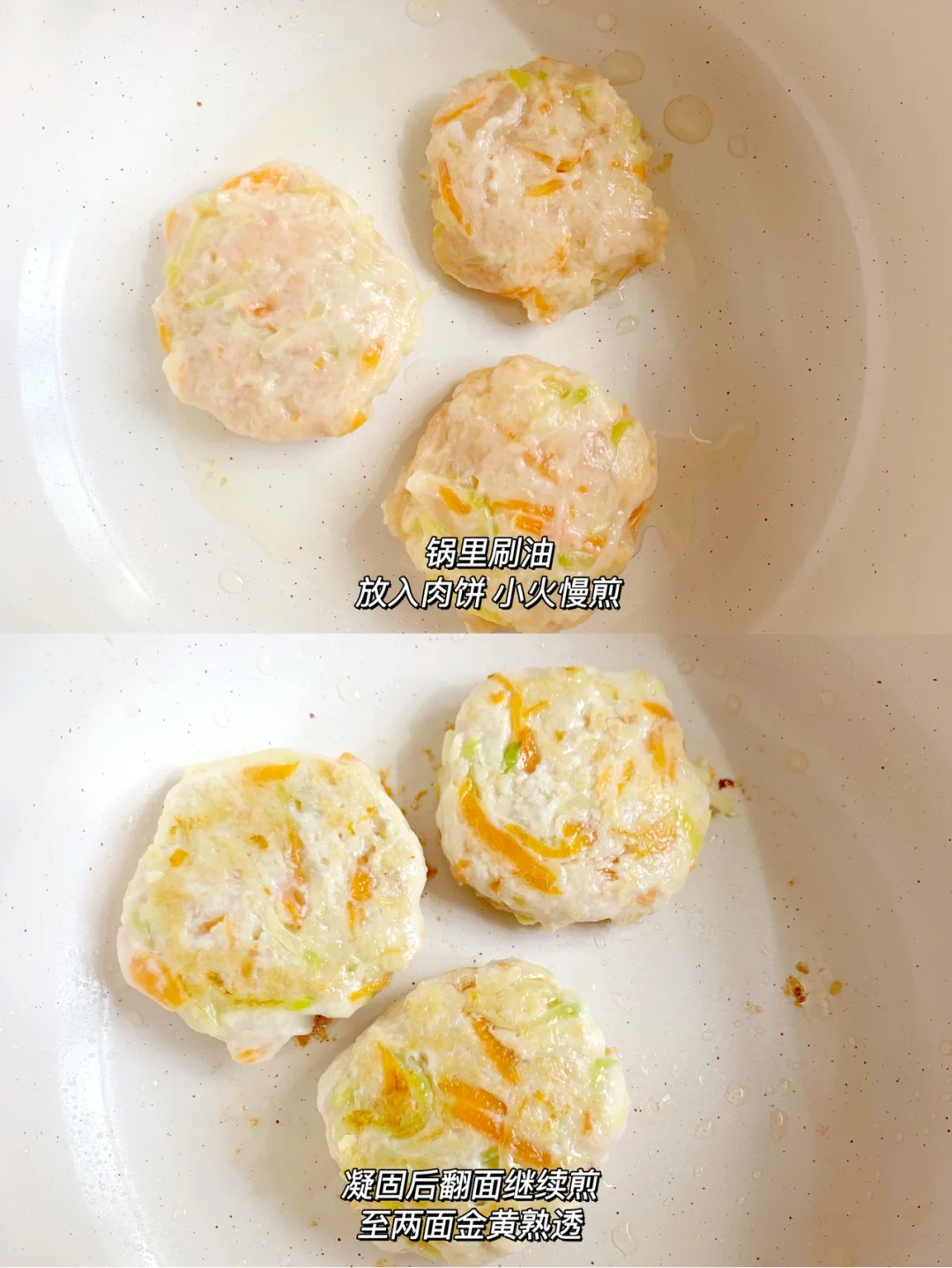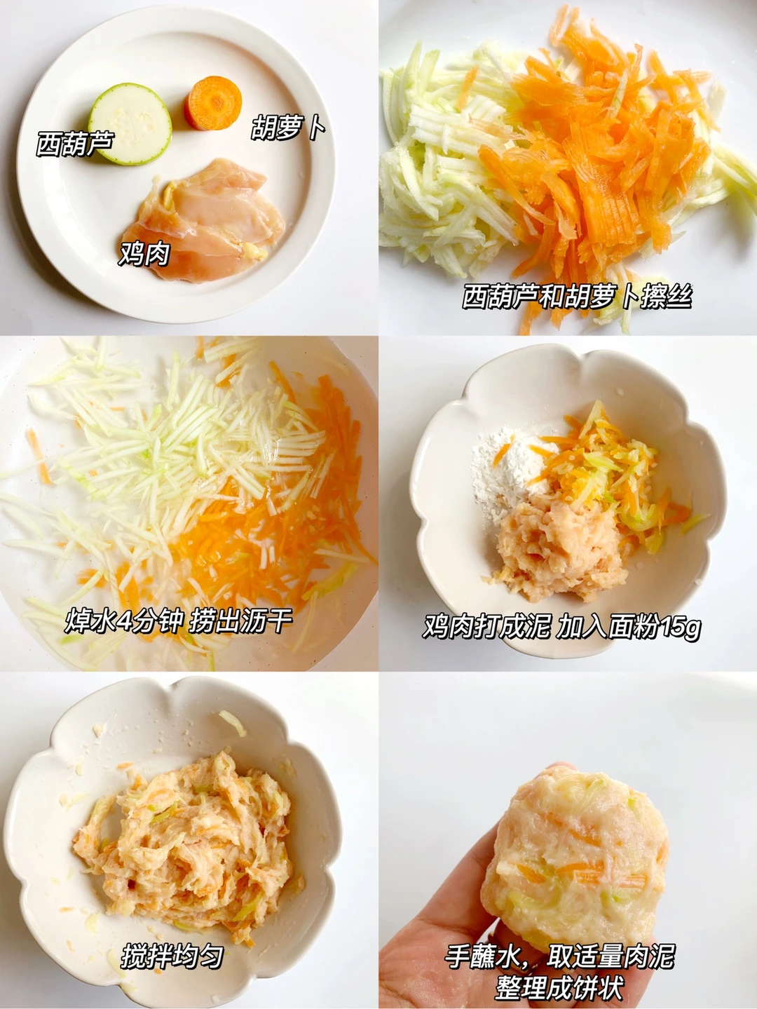 蔬菜搭配鸡肉做的小饼,太好吃了,鲜香美味,一点也不柴,一口下去可以给娃补充维生素和蛋白质,营养又好吃,你们一定要试试 🌈无鸡蛋版的,敏宝也可以吃哦 ~~ ~~ 🌟食材 西葫芦 胡萝卜 面粉15克 鸡肉 . 🌟做法 1⃣️胡萝卜和西葫芦擦丝,焯水4分钟,捞出沥干 2⃣ 鸡肉放入辅食机打成泥,加入面粉,西葫芦和胡萝卜搅拌均匀,手蘸水,取适量肉泥整理成饼状 3⃣️锅里刷油,放入饼,小火慢煎,两面煎至金黄熟透即可