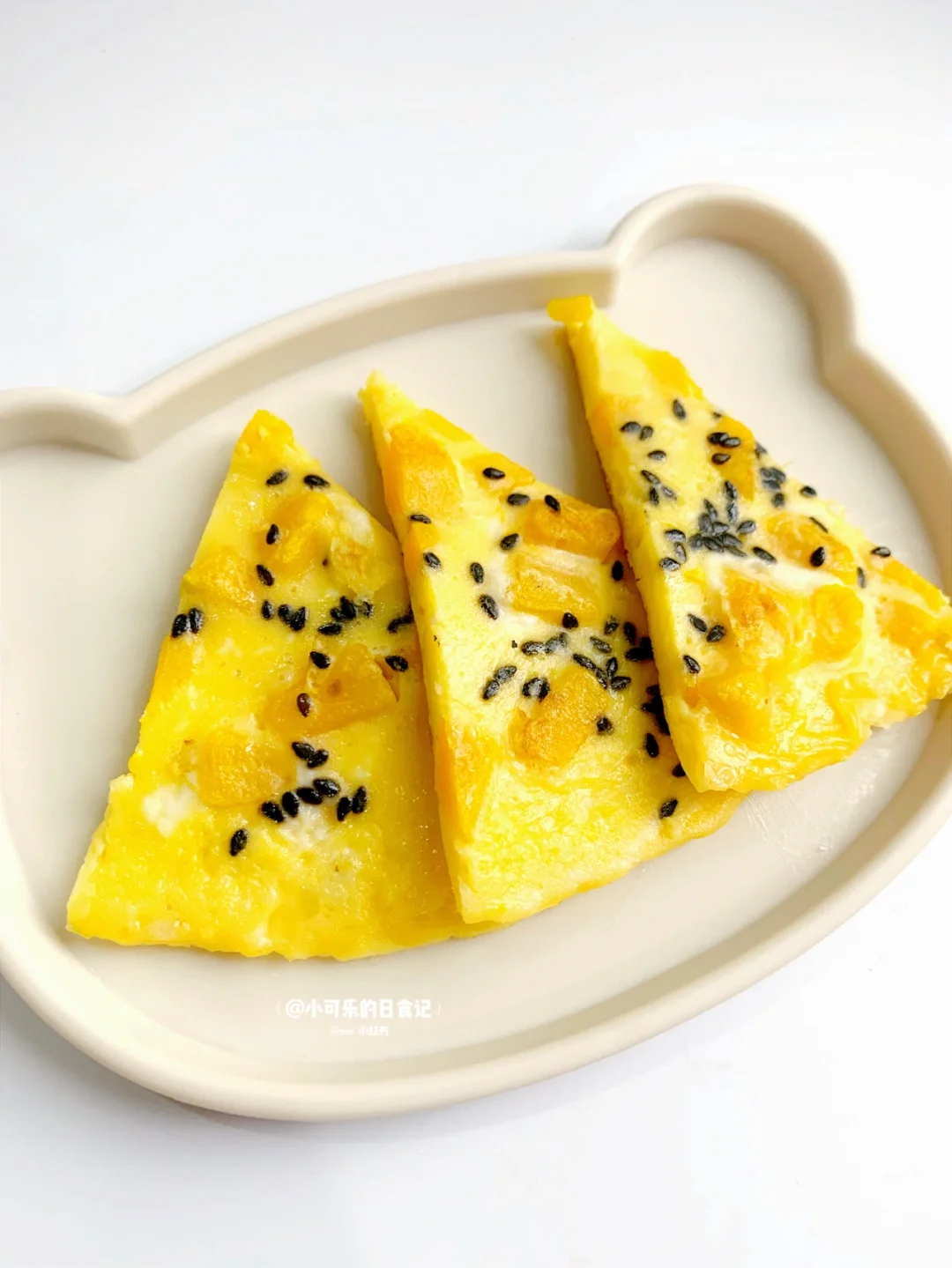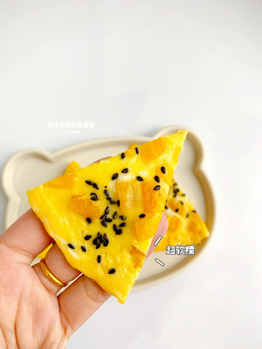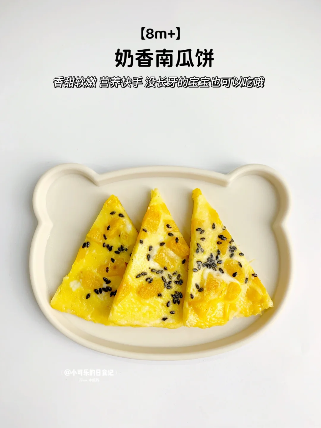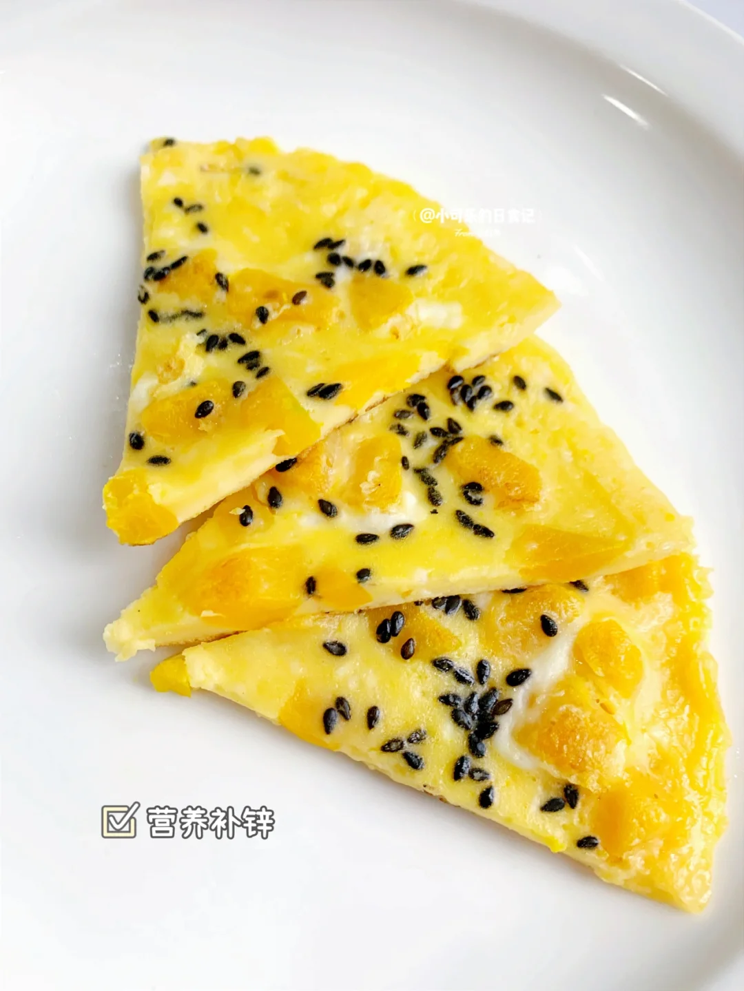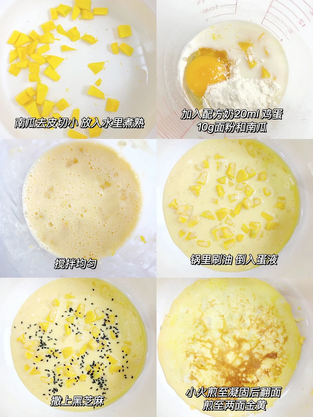 这是一款快手的小饼[害羞R] 当做早餐或者下午茶,或者当作手指食物搭配其他主食也可以,香甜软糯,还没长牙的宝宝也可以吃哦[赞R] ———— 🌟食材 南瓜、配方奶毫升、鸡蛋、面粉10克 🌟做法 1⃣️南瓜切小丁放入水里煮熟,捞出沥干 2⃣️碗里打入鸡蛋➕配方奶➕南瓜➕面粉 搅拌均匀 3⃣️锅里刷油,倒入蛋液平铺,小火慢煎,撒上黑芝麻,凝固后翻面煎至两面金黄熟即可