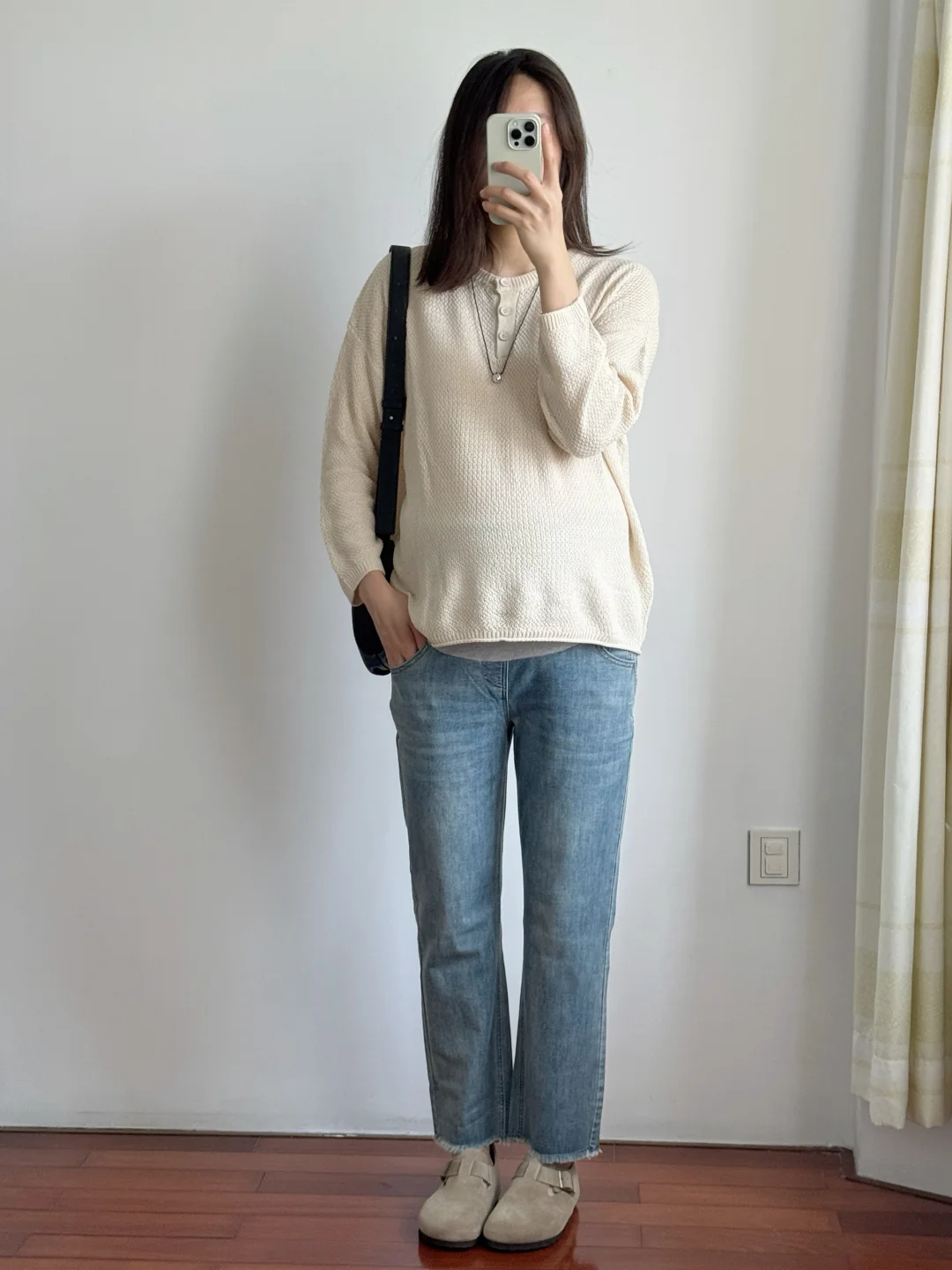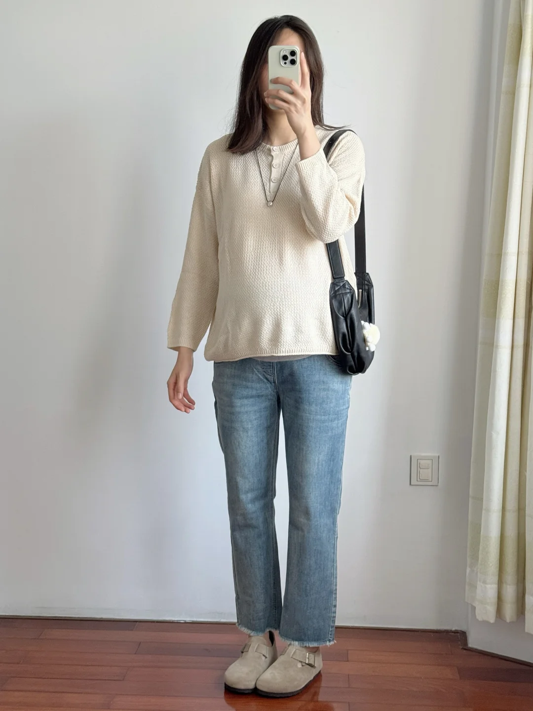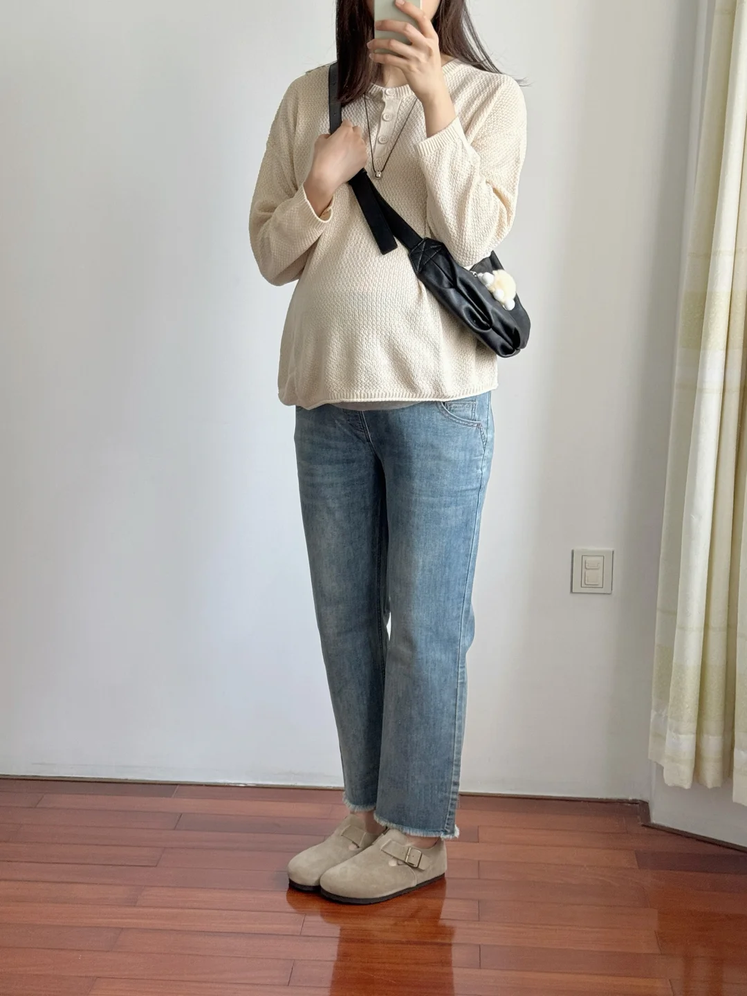 孕34周啦 上周也做了首次胎监 数据非常不错 是个爱运动的宝宝 每天在肚子里练习踢腿动作 稳住双顶径呀宝贝 坐标广东 特别期待凉爽的秋天 虽然短暂 但还是很期待穿着薄长袖出门 之后就带着一个小挂件出门啦 分享4件非常满意的初秋单品 ~小挎包 入了好几年依然很喜欢的小包 能斜挎又手提 怎么背都好看 关键还很能装东西 小小一个出门必须品足够了 就很喜欢这种简约的长期主义 ~直筒牛仔裤 谁说孕期不能穿牛仔裤 秋天就狠狠穿起来! 托腹设计可调节腰围 包裹孕肚 显瘦又显直腿 产后也能继续穿 怎么搭配怎么好看 ~镂空花纹小衬衫 薄款衬衫很适合初秋 不热不凉的季节 小设计比如蝙蝠袖 底部是镂空花纹设计 简约又耐看 怎么搭都舒适好看 ~勃肯鞋 初秋偏爱勃肯 一整个色系温柔住 一脚蹬方便 孕期水肿jio也能穿 买大一码即可 包跟设计通勤方便 其实半包我也想拥有 入了喜欢的单品心情舒畅 孕期也能穿得舒适又好看