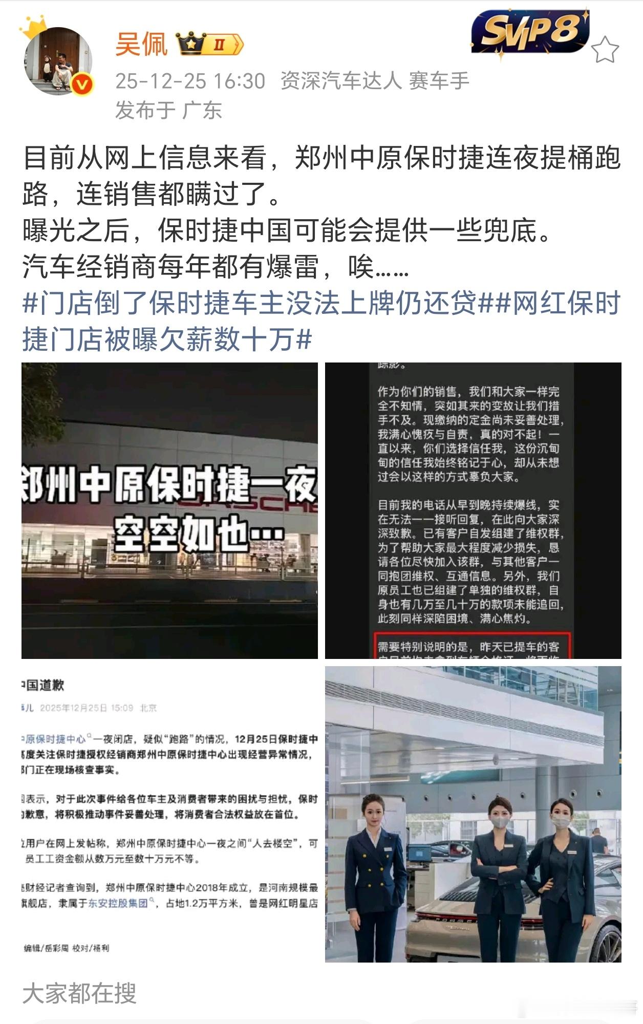 门店倒了保时捷车主没法上牌仍还贷网红保时捷门店被曝欠薪数十万 这家网红保时捷店跑路太坑了!车主付了款拿不到车,甚至车没法上牌还得还贷,员工也被欠薪,简直一地鸡毛。好在官方已介入,希望问题能早日解决。 科技犬总结