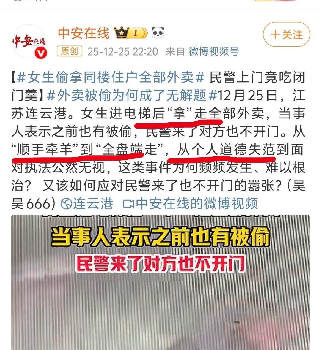 女生偷拿同楼住户全部外卖明确行为是偷之后,还要把“拿”字拖进来“共沉沦”?还要扯什么“个人道德失范”?小偷不开门就可以躲过法律的惩罚?倒底是什么让媒体失去了说人话办人事的能力?