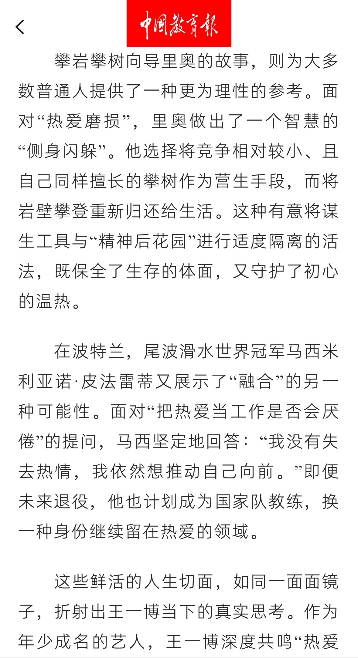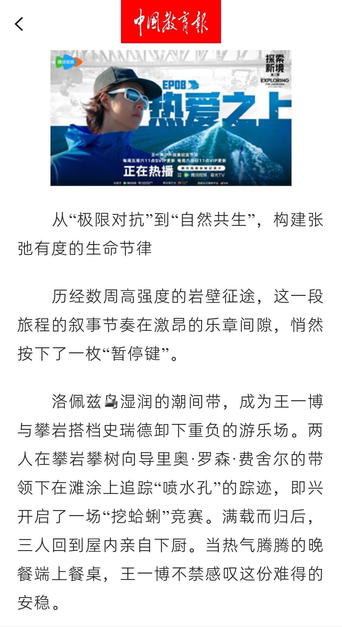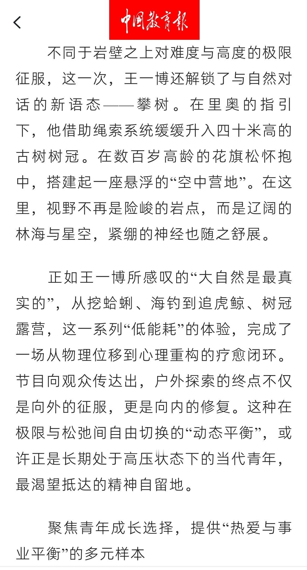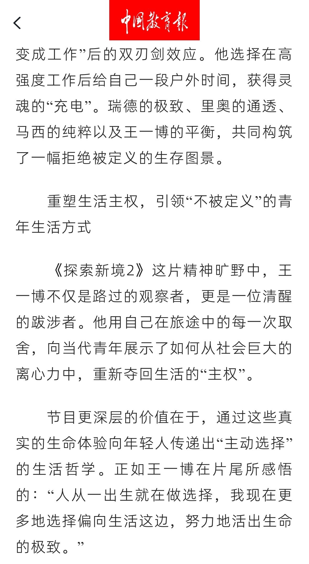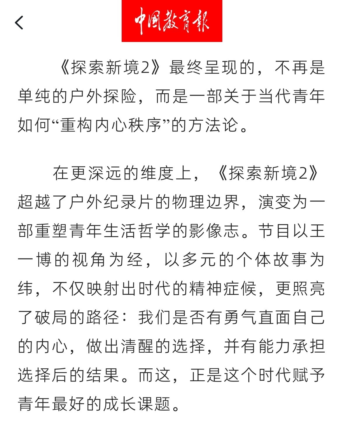 中国教育报发文评探索新境2:“这种在极限与松弛间自由切换的“动态平衡”,或许正是长期处于高压状态下的当代青年,最渴望抵达的精神自留地。”“作为年少成名的艺人,王一博深度共鸣“热爱变成工作”后的双刃剑效应。他选择在高强度工作后给自己一段户外时间,获得灵魂的“充电”。瑞德的极致、里奥的通透、马西的纯粹以及王一博的平衡,共同构筑了一幅拒绝被定义的生存图景。”“在更深远的维度上,《探索新境2》超越了户外纪录片的物理边界,演变为一部重塑青年生活哲学的影像志。节目以王一博的视角为经,以多元的个体故事为纬,不仅映射出时代的精神症候,更照亮了破局的路径:我们是否有勇气直面自己的内心,做出清醒的选择,并有能力承担选择后的结果。而这,正是这个时代赋予青年最好的成长课题。”
