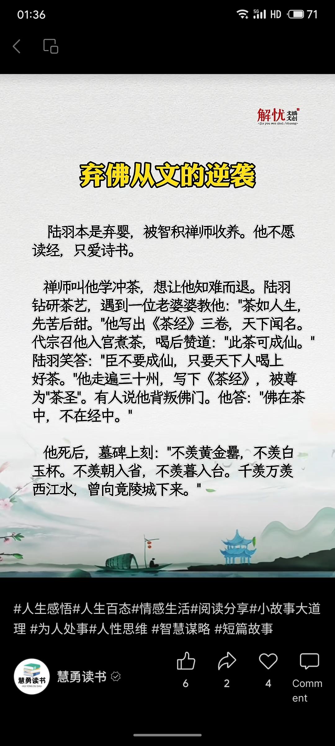 唐代陆羽原为弃婴,被禅师收养却志在茶艺。他受“茶如人生”启发,遍访各地著成《茶经》,被尊为茶圣。其主张“佛在茶中”,以茶传播智慧,不求功名。
