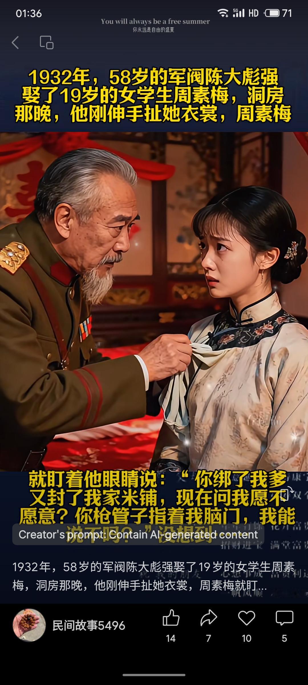 1932年,58岁军阀陈大彪强娶19岁女学生周素梅。洞房夜,周素梅直面质问其绑父封铺、持枪逼迫的暴行。