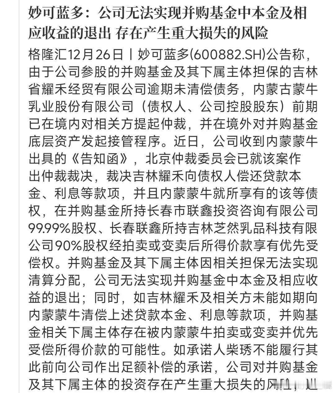 什么叫悲剧,妙可蓝多这就是悲剧,几万股民将会无眠妙可蓝多之前投了1个亿的并购基金,还持有相关公司10%股权,很可能这部分资金要不回来而且还会搭上一些资金。这个并购基金帮吉林耀禾做了债务担保,结果吉林耀禾还不上钱,债权人正是妙可蓝多的大股东蒙牛。如果吉林耀禾没钱,那就会拍卖基金股权来抵债,妙可蓝多就会血本无归,直接变成投资失败。如果这笔投资最后要不到钱就会出现投资和收益双双亏损的情况,最后就是公司的利润就会严重缩水,导致股价暴跌