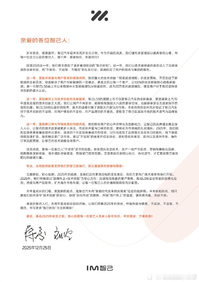 智己到现在已经5周岁了。在这个关键节点上,智己也取得了一项非常关键的成绩。就是在这个12月,智己实现了全成本口径的盈利。也就是说把杂七杂八的各种成本算上,智己开始挣钱了。这对于一个新品牌乃至整个上汽的高端化征程来说,都是非常振奋人心的一步。同时,这也意味着,凭借LS6、LS9两大新品,智己越来越找到了自己的发展节奏,接下来就是探索如何实现季度盈利、年度盈利。到明年,智己LS8也会上市,这肯定是智己搏得更大市场成果的又一关键武器。大家看好明年的智己吗?智己五周年实现单月盈利