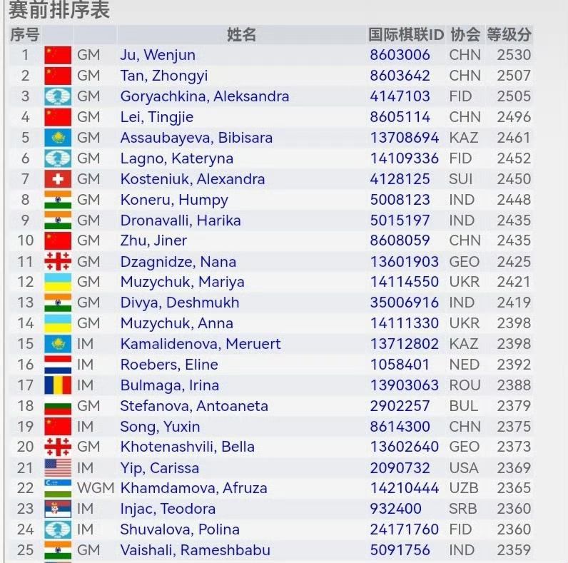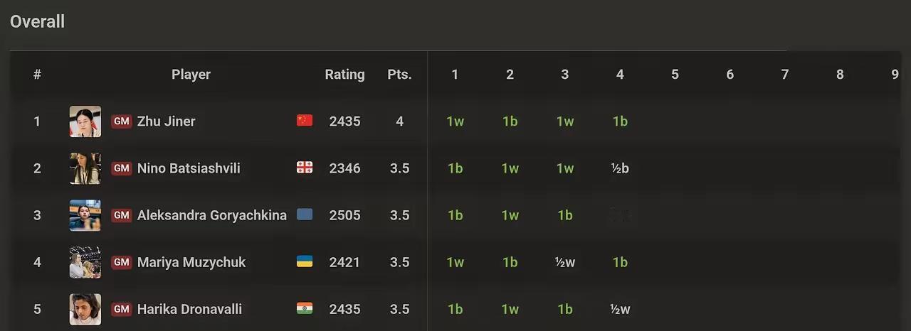 2025国际象棋女子快棋世锦赛 四轮战罢朱锦尔四连胜领跑积分榜! 12月26日,在中国上海进行的国际象棋快棋世锦赛结束了前四轮的比赛,朱锦尔四战四胜积4分单独领先,宋宇新3.5分位居第二集团,雷挺婕、谭中怡、居文君3分位居第三集团。 本届比赛,今天晚上再战四轮,明天晚上再战三轮,即决出冠军。 快棋世锦赛结束后,接着进行超快棋世锦赛。这两个比赛的结果,将产生女子世界冠军候选人赛最后一张入场券。 中国棋手,加油!