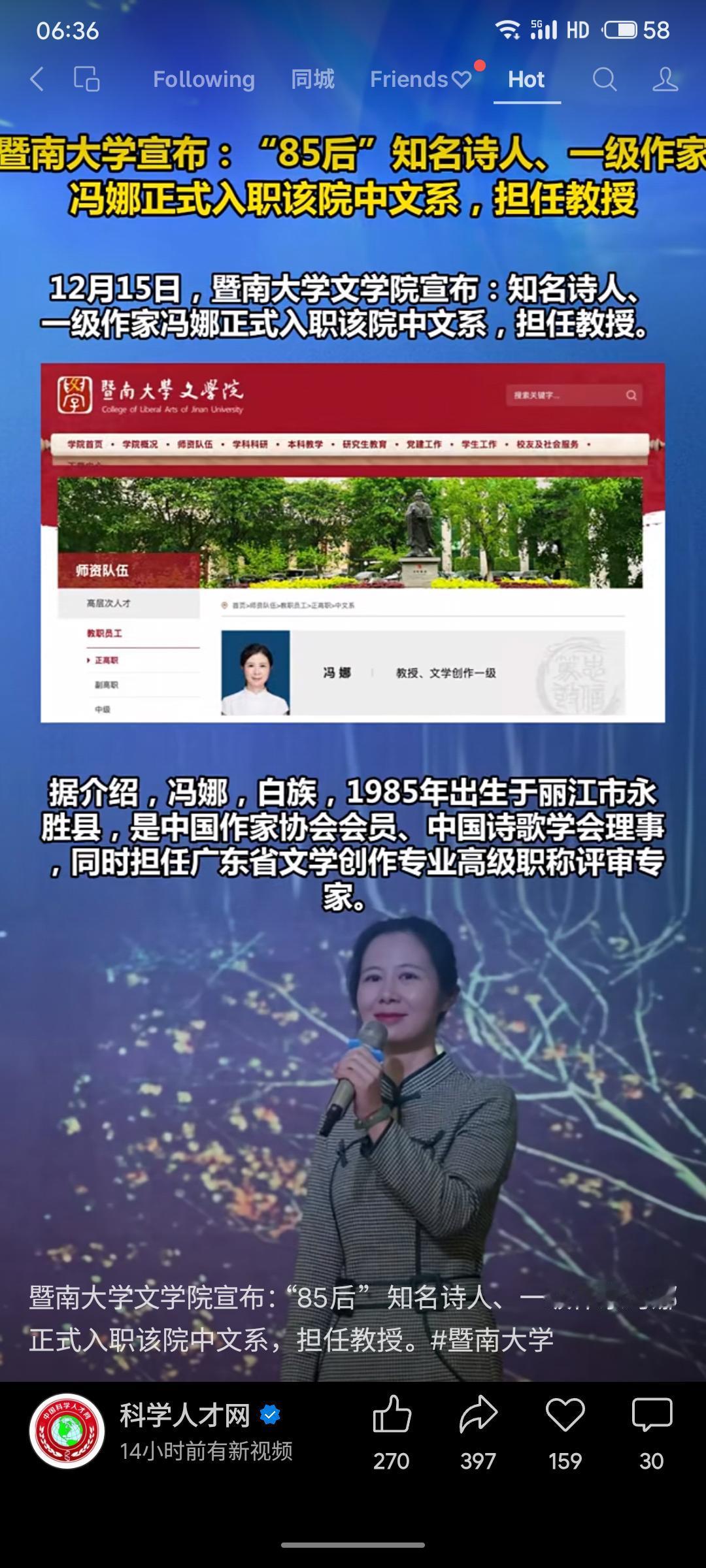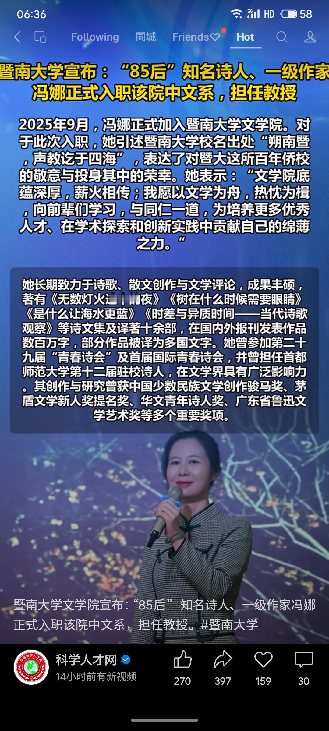 “85后”白族诗人、一级作家冯娜近日正式入职暨南大学文学院,担任中文系教授。她创作成果丰硕,曾获中国少数民族文学创作骏马奖等多项重要奖项。此次入职,她希望以文学为舟,为培养人才与学术探索贡献力量。