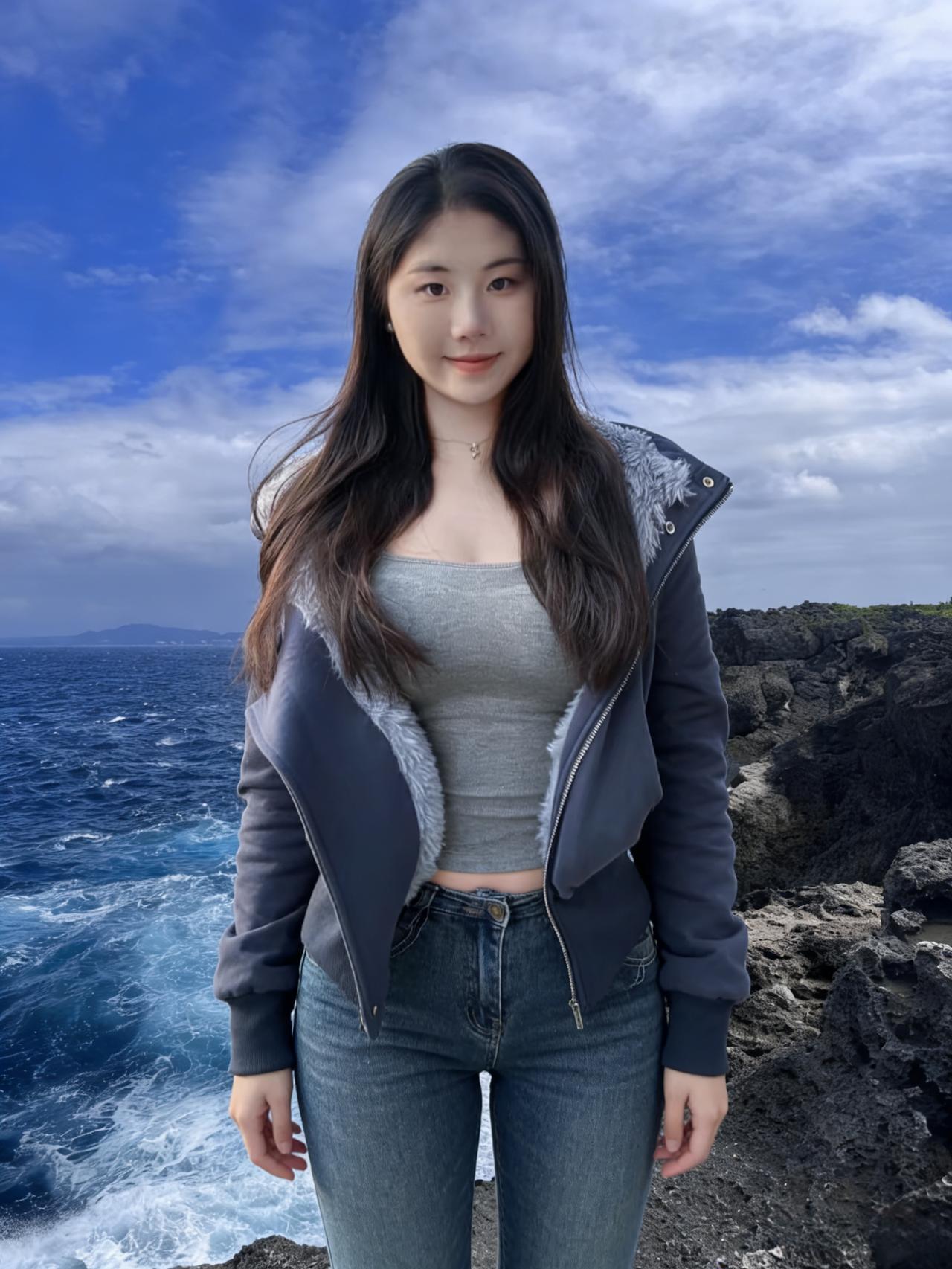 海崖风起浪滔天,灰袂凌风舞翩翩。 卷发轻扬遮粉面,薄衫微露小蛮肩。 身依礁岸观潮涌,目断沧溟寄意绵。 玉颈轻摇凝秀色,纤腰乍立锁寒烟。 云横远岫天垂碧,浪打危矶石吐涎。 莫道青春多怅惘,伊人胸怀蕴江川。