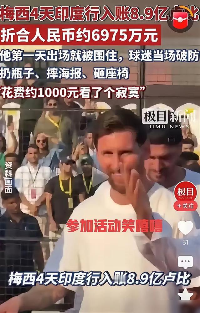 梅西的4天印度行,他此行入账8.9亿卢比,折合人民币约6975万元。结果转头印度就把主办方给查了,直接把钱扣下再说。 这事儿可真不稀奇。 印度这操作,老江湖们都懂。 哪是第一次这么干。 国外大公司明星,被坑的还少吗? 钱没出境,啥都好说。 人一走,茶就凉。 各种理由就来了。 梅西这趟,估计也懵。 辛苦跑一趟,钱可能打水漂。 主办方被查,钱被扣,太典型了。 所以说,去那边做生意搞活动,心真得大。 合同啥的,有时候就是张纸。 人家说变就变。 咱们这边办事,讲究个诚信。 他们那套路,真是看不懂。 也不是针对谁,就是习惯这样。 球迷看着都憋屈。 球王估计也笑不出来了。 就当买个教训吧。 还是自己家里好。 规矩清楚,踏实。 这种热闹,以后少凑为妙。