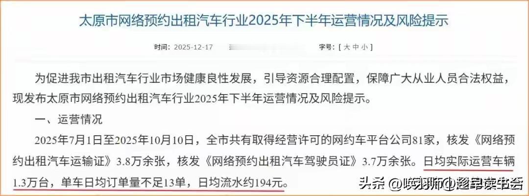 多地网约车行业数据揭示严峻现实:珠海超5000辆合规车月内“零订单”,超六成司机日均流水极低,需工作12小时以上才可能实现约300元营收,扣除成本后月收入仅约4000元。太原、苏州等多城超半数合规车处于“闲置”状态。核心困局是供需严重失衡:在平台早期补贴刺激下,车辆与司机供给激增,而城市出行总需求见顶,导致“僧多粥少”。这造成双重民生困境:司机陷入“用时间换温饱”的生存博弈,缺乏保障;乘客则面临服务体验与安全隐患。破局需三方合力:政府科学调控运力并探索权益保障;平台优化派单算法、重构抽成机制;潜在从业者需理性评估,避免盲目入行。行业必须从粗放扩张转向健康、可持续的精细化发展。网约车行业 网约车行业标准 网约车收入 网约车平台单量 网约车平台流水 网约车违法经营 网约车租车行业 网约车经济 网约车市场整顿 网约车市场 珠海网约车收入 珠海网约车 珠海网约车出租 珠海网约车证 珠海滴滴租车 宁波网约车收入