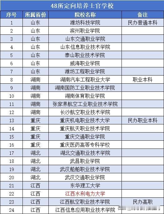 全国共有48所职业院校定向培养士官,由于其有良好的保障,当前对考生的吸引力越来越强,录取分数逐年提高。 按省份分布,数量最多的是山东省,共有6所;其次是湖南省,有5所;重庆、湖北、江西各有4所;江苏、陕西各有3所;安徽、北京、河南、辽宁、宁夏、四川、浙江各有2所;甘肃、吉林、西藏、新疆各有1所。 此前,只有江西的2所是公办本科院校、陕西有一所公办本科和山东的1所民办本科,现在随着职业本科院校的推进,这48所院校中又新增了8所本科职业本科,其中7所是公办职业本科。现在还有滨州职业学院、阜阳职业技术学院、重庆医药高等专科学校和新疆石河子职业技术学院等专科院校公示升格为本科。 定向士官生高校 大学