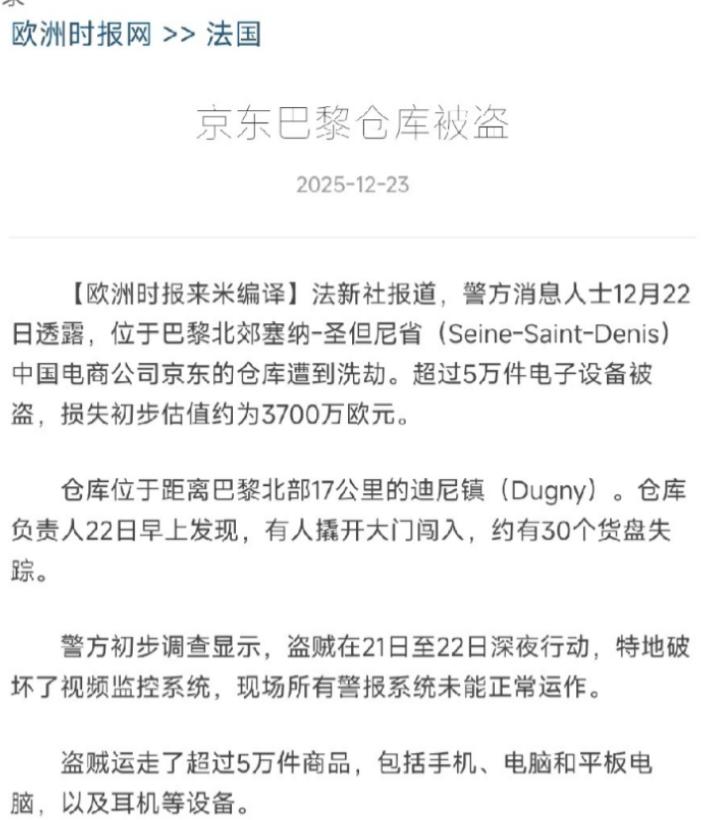 京东巴黎仓库被洗劫300万欧元,很多人以为是法国治安太差,遇上了流氓,错了!真相是,这是一场精准到秒的“内鬼级”军事行动! 京东在巴黎的仓库遭了洗劫,不少人第一反应就是法国治安不行,遇上了街头流氓随机作案。 但事实根本不是这样,这事儿从头到尾都是一场计划周密的精准行动,说是“内鬼级”军事行动一点不夸张。 案发时间选得特别讲究,刚好在圣诞购物旺季前夕的深夜,这时候仓库里囤满了准备配送的热门电子产品,而且这个时间段仓库里的值班人员特别少,安保警惕性也最低。 更关键的是,这帮人作案前显然做足了功课,对仓库的情况摸得一清二楚。 他们不是硬闯进去的,而是分好组同步动手,一组先去破坏仓库里的监控设备,连存储视频的服务器都给弄坏了,彻底断了影像证据,整个过程没弄出大动静。 另一组直接直奔仓库大门,没用暴力砸门的方式,而是用专业工具精准拆掉了大门的铰链,这种手法又快又不容易留下痕迹。 更蹊跷的是,仓库的警报系统在案发时完全没触发,既没发出响声,也没给安保公司传信号,像是提前就被摸清了漏洞。 进了仓库之后,这帮人更是直奔主题,压根没像普通小偷那样到处乱翻,他们直接找到存放高价值电子产品的区域,目标特别明确。 之后,提前停在周边的几辆伪装货车就开了进来,装车的时候分工明确,有条不紊。 更专业的是,他们还改动了货物托盘上的标签,让仓库的管理系统误以为这些货物是正常出库,为撤离争取了不少时间。 装完货之后,这帮人还简单清理了现场,把散落的包装碎片都收走了,没留下多少痕迹。 撤离的时候也选好了路线,专门避开主要交通要道的监控,甚至没开大灯高亮模式,生怕被拍到。 等第二天工作人员上班,才发现大门敞开,监控全坏了,高价值货物已经不见了。 事情发生后,京东很快就回应了,确认仓库确实遭了盗抢,当地警方已经立案调查,自己也在全力配合提供线索。 京东还说仓库已经恢复正常运营,没对订单交付造成大的影响,而法国警方调查后也明确,这是有组织的团伙作案,核心怀疑方向就是内部有人泄密。 毕竟能精准掌握仓库布局、货物位置、安保排班和系统漏洞,没有内部人员配合,根本不可能做到这么天衣无缝。 这起事件也提醒,海外仓库的安全防护,不光要防外面的贼,更要堵住内部的漏洞。