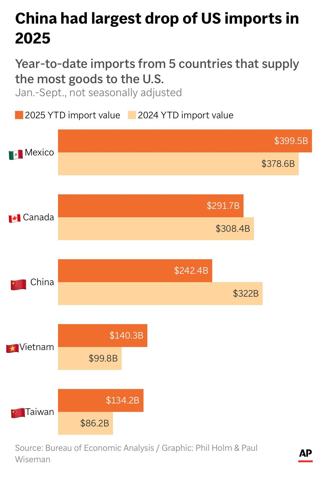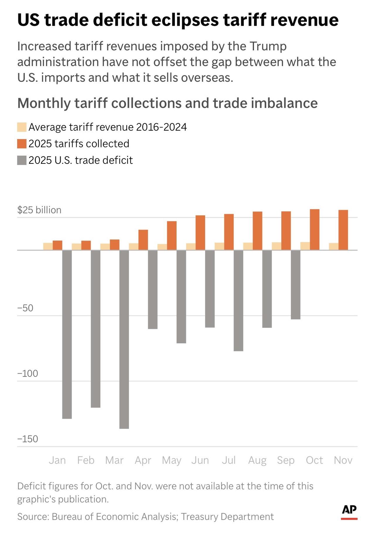 美国11月份平均有效关税17%,是1月份的7倍,为1935年以来最高。但增加关税对减少贸易逆差没有什么影响,今年1-9月(之后的数据还未公布)的贸易逆差比去年同期增加17%。特朗普政府征收的关税收入并未弥补美国进口额与海外销售额之间的差距。受影响最大的是中美贸易,从中国进口减少47.5%。